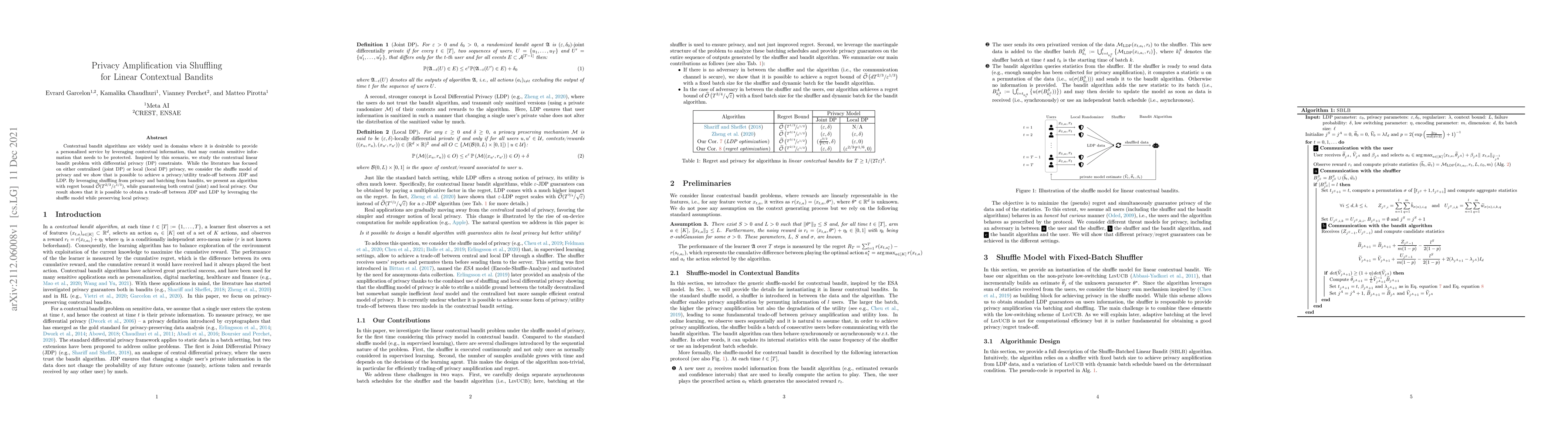 This paper proposes an algorithm for contextual linear bandits that achieves a privacy/utility trade-off between joint and local differential privacy using the shuffle model. The algorithm guarantees both central and local privacy while maintaining a regret bound of $\widetilde{\mathcal{O}}(T^{2/3}/\varepsilon^{1/3})$.