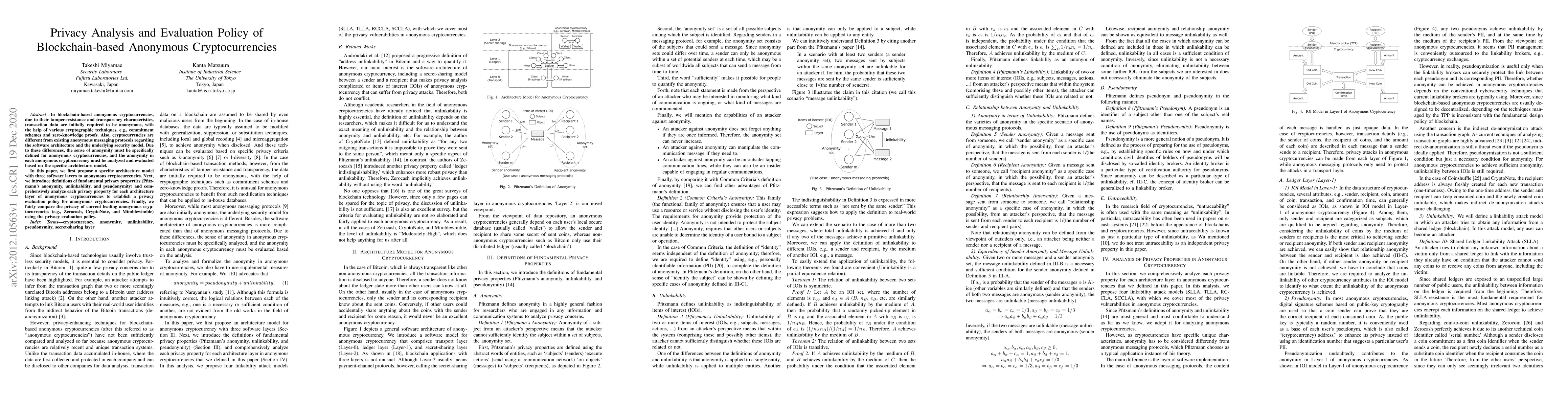 This paper proposes a specific architecture model for blockchain-based anonymous cryptocurrencies and defines fundamental privacy properties to analyze and evaluate their anonymity. It compares the privacy of leading anonymous cryptocurrencies using a newly established privacy evaluation policy.