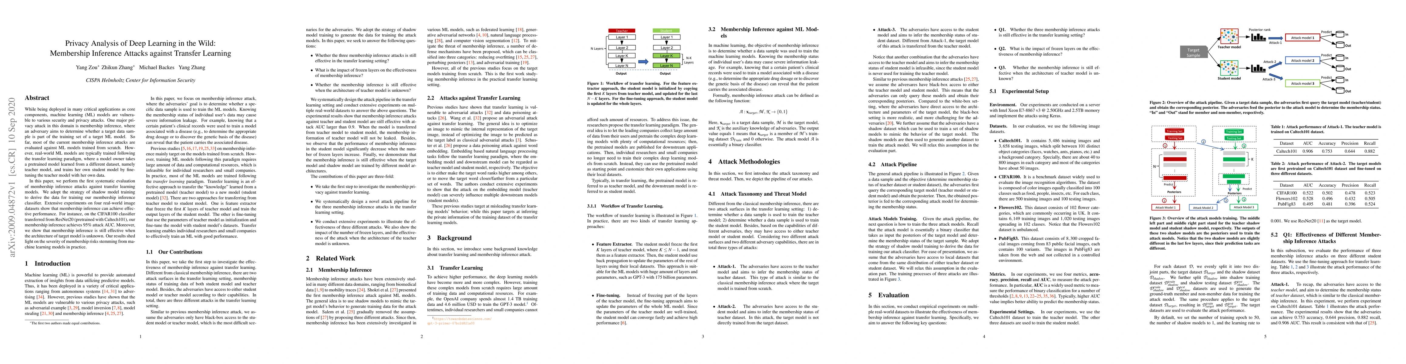 This paper investigates membership inference attacks against transfer learning models, demonstrating that such attacks can effectively determine if a sample was part of the training set, achieving a 95% attack AUC on CIFAR100. The study highlights the significant privacy risks posed by real-world machine learning models trained using transfer learning.
