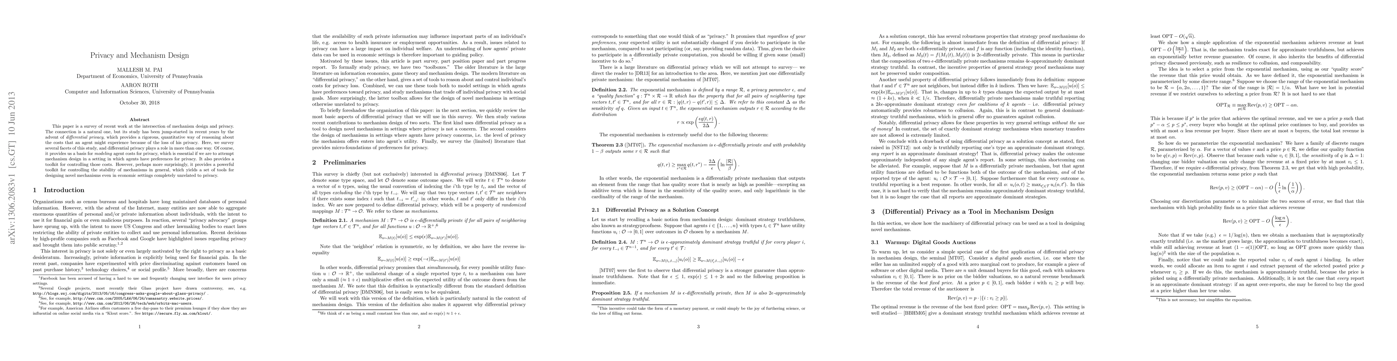 This paper is a survey of recent work at the intersection of mechanism design and privacy. The connection is a natural one, but its study has been jump-started in recent years by the advent of differential privacy, which provides a rigorous, quantitative way of reasoning about the costs that an agent might experience because of the loss of his privacy. Here, we survey several facets of this study, and differential privacy plays a role in more than one way. Of course, it provides us a basis for modeling agent costs for privacy, which is essential if we are to attempt mechanism design in a setting in which agents have preferences for privacy. It also provides a toolkit for controlling those costs. However, perhaps more surprisingly, it provides a powerful toolkit for controlling the stability of mechanisms in general, which yields a set of tools for designing novel mechanisms even in economic settings completely unrelated to privacy.