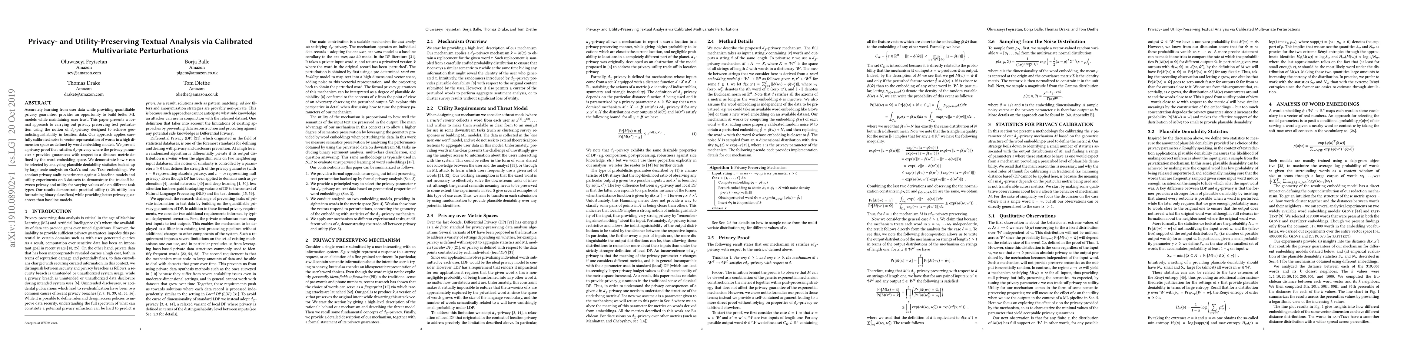 This paper presents a method for privacy-preserving textual analysis using calibrated multivariate perturbations to word embeddings, achieving geo-indistinguishability and satisfying dx-privacy. Experiments show minimal utility loss (< 2%) while outperforming baselines in privacy guarantees.