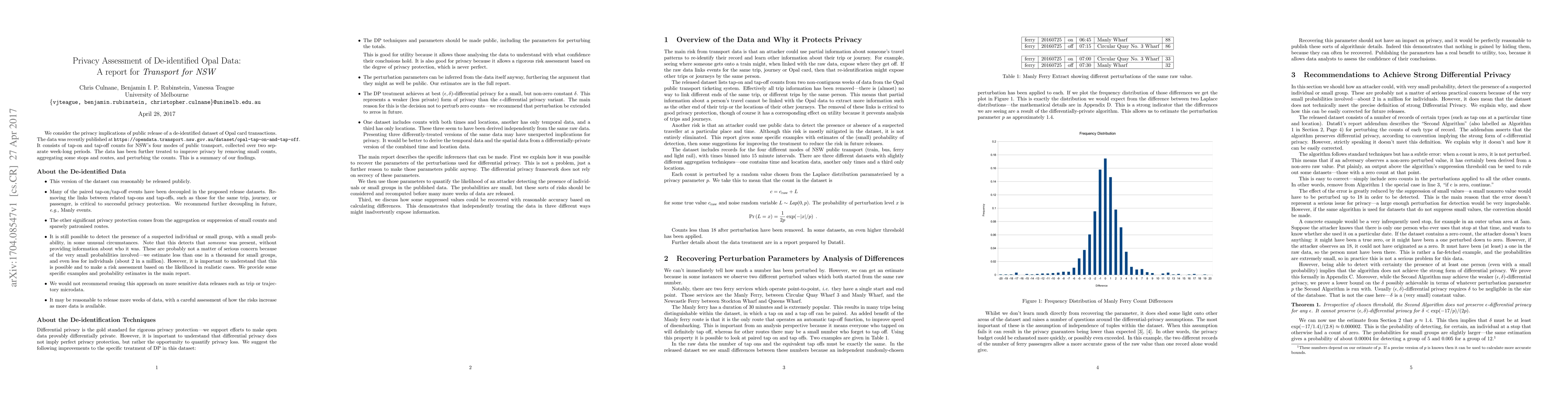 We consider the privacy implications of public release of a de-identified dataset of Opal card transactions. The data was recently published at https://opendata.transport.nsw.gov.au/dataset/opal-tap-on-and-tap-off. It consists of tap-on and tap-off counts for NSW's four modes of public transport, collected over two separate week-long periods. The data has been further treated to improve privacy by removing small counts, aggregating some stops and routes, and perturbing the counts. This is a summary of our findings.