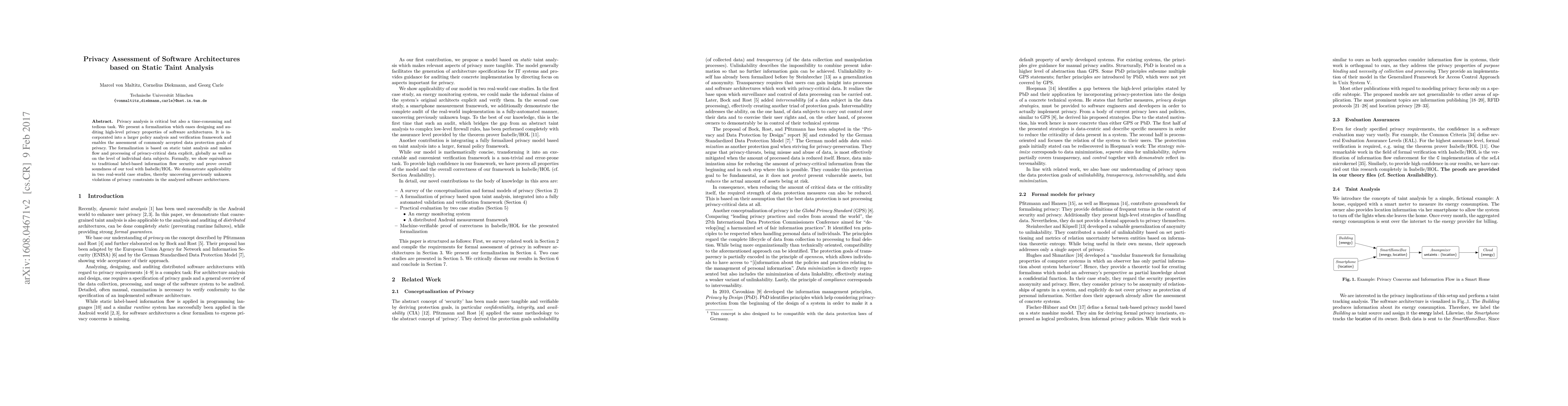 This paper presents a formalization for assessing privacy properties in software architectures using static taint analysis, enabling easier design and auditing of high-level privacy goals. The method is shown to be equivalent to traditional label-based information flow security and demonstrated to be sound through Isabelle/HOL proofs, with real-world case studies revealing previously unknown privacy violations.