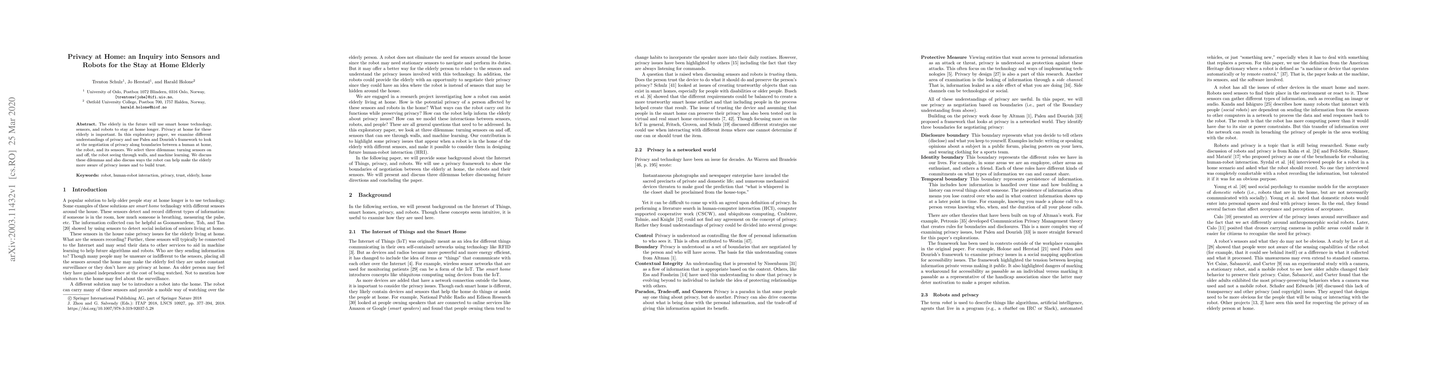 This paper explores privacy concerns for elderly individuals using smart home technology, focusing on the negotiation of privacy between humans, robots, and sensors. It examines specific dilemmas such as sensor management, robotic surveillance, and machine learning, and suggests ways robots can enhance privacy awareness and trust.