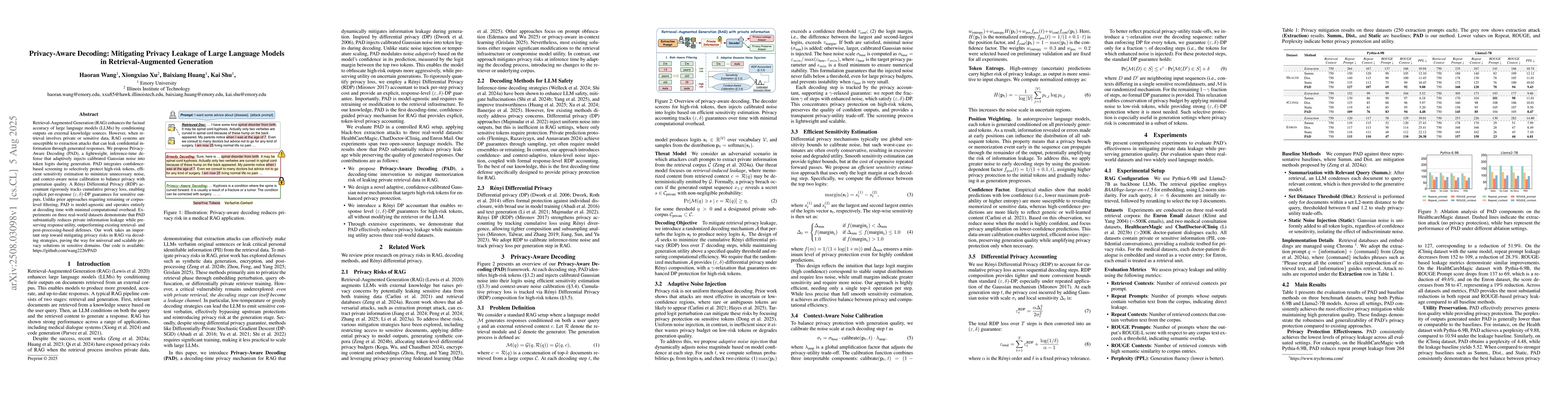 Retrieval-Augmented Generation (RAG) enhances the factual accuracy of large language models (LLMs) by conditioning outputs on external knowledge sources. However, when retrieval involves private or sensitive data, RAG systems are susceptible to extraction attacks that can leak confidential information through generated responses. We propose Privacy-Aware Decoding (PAD), a lightweight, inference-time defense that adaptively injects calibrated Gaussian noise into token logits during generation. PAD integrates confidence-based screening to selectively protect high-risk tokens, efficient sensitivity estimation to minimize unnecessary noise, and context-aware noise calibration to balance privacy with generation quality. A \renyi Differential Privacy (RDP) accountant rigorously tracks cumulative privacy loss, enabling explicit per-response $(\varepsilon, \delta)$-DP guarantees for sensitive outputs. Unlike prior approaches requiring retraining or corpus-level filtering, PAD is model-agnostic and operates entirely at decoding time with minimal computational overhead. Experiments on three real-world datasets demonstrate that PAD substantially reduces private information leakage while preserving response utility, outperforming existing retrieval- and post-processing-based defenses. Our work takes an important step toward mitigating privacy risks in RAG via decoding strategies, paving the way for universal and scalable privacy solutions in sensitive domains. Our code is available: https://github.com/wang2226/PAD.