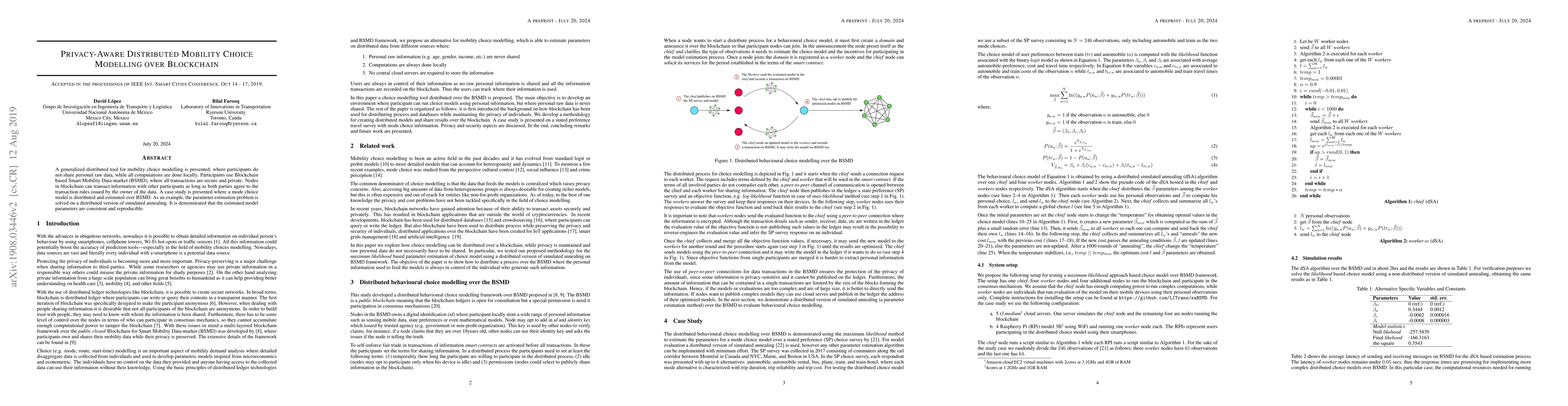 A generalized distributed tool for mobility choice modelling is presented, where participants do not share personal raw data, while all computations are done locally. Participants use Blockchain based Smart Mobility Data-market (BSMD), where all transactions are secure and private. Nodes in blockchain can transact information with other participants as long as both parties agree to the transaction rules issued by the owner of the data. A case study is presented where a mode choice model is distributed and estimated over BSMD. As an example, the parameter estimation problem is solved on a distributed version of simulated annealing. It is demonstrated that the estimated model parameters are consistent and reproducible.