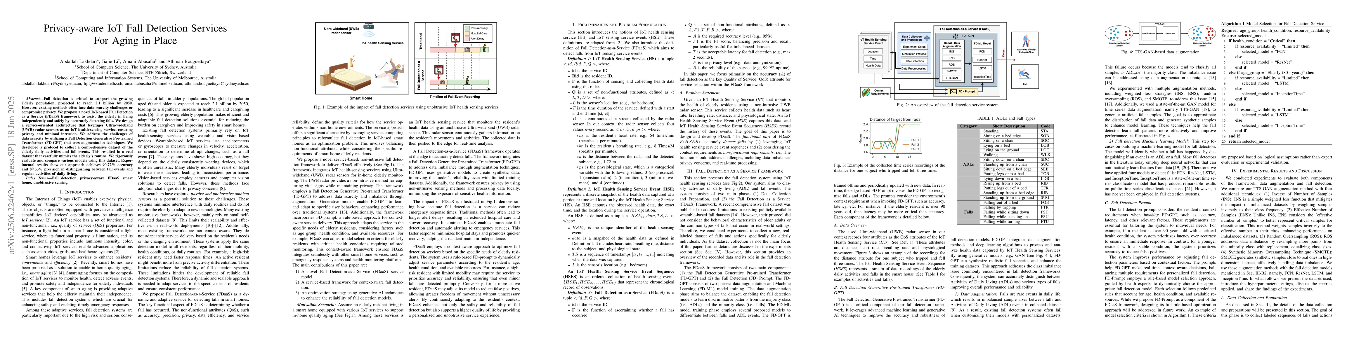 Fall detection is critical to support the growing elderly population, projected to reach 2.1 billion by 2050. However, existing methods often face data scarcity challenges or compromise privacy. We propose a novel IoT-based Fall Detection as a Service (FDaaS) framework to assist the elderly in living independently and safely by accurately detecting falls. We design a service-oriented architecture that leverages Ultra-wideband (UWB) radar sensors as an IoT health-sensing service, ensuring privacy and minimal intrusion. We address the challenges of data scarcity by utilizing a Fall Detection Generative Pre-trained Transformer (FD-GPT) that uses augmentation techniques. We developed a protocol to collect a comprehensive dataset of the elderly daily activities and fall events. This resulted in a real dataset that carefully mimics the elderly's routine. We rigorously evaluate and compare various models using this dataset. Experimental results show our approach achieves 90.72% accuracy and 89.33% precision in distinguishing between fall events and regular activities of daily living.