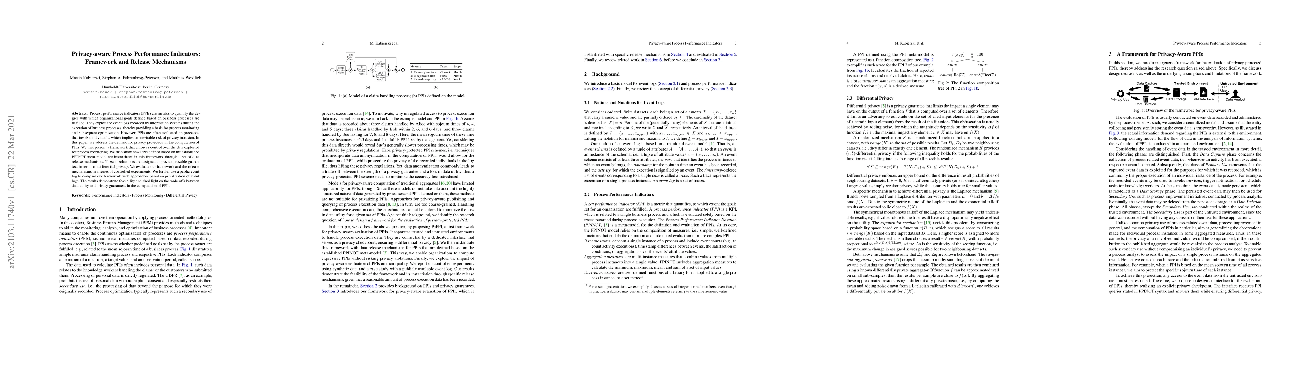 Process performance indicators (PPIs) are metrics to quantify the degree with which organizational goals defined based on business processes are fulfilled. They exploit the event logs recorded by information systems during the execution of business processes, thereby providing a basis for process monitoring and subsequent optimization. However, PPIs are often evaluated on processes that involve individuals, which implies an inevitable risk of privacy intrusion. In this paper, we address the demand for privacy protection in the computation of PPIs. We first present a framework that enforces control over the data exploited for process monitoring. We then show how PPIs defined based on the established PPINOT meta-model are instantiated in this framework through a set of data release mechanisms. These mechanisms are designed to provide provable guarantees in terms of differential privacy. We evaluate our framework and the release mechanisms in a series of controlled experiments. We further use a public event log to compare our framework with approaches based on privatization of event logs. The results demonstrate feasibility and shed light on the trade-offs between data utility and privacy guarantees in the computation of PPIs.