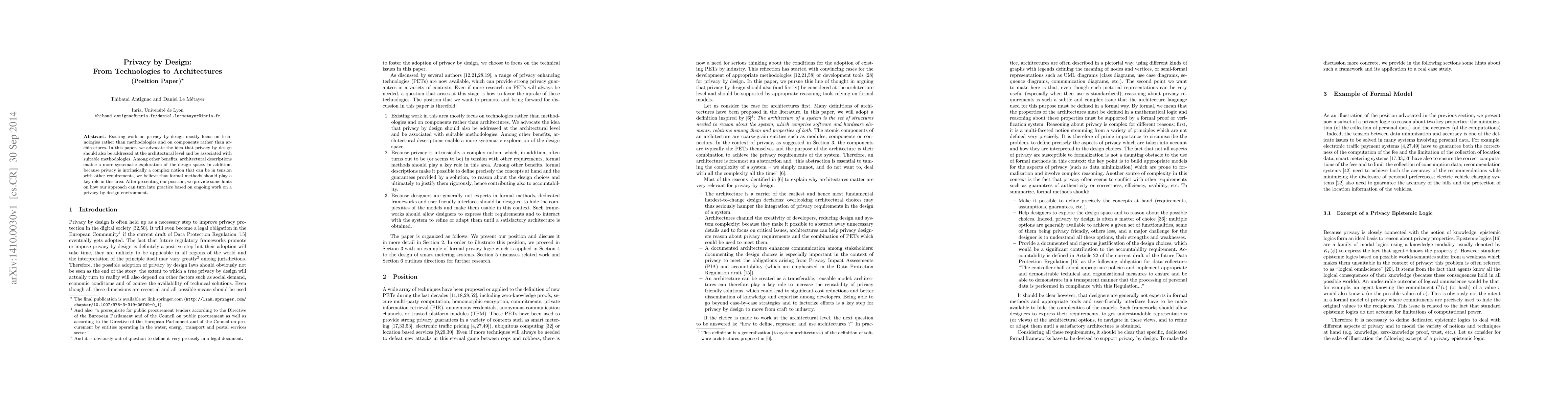 This paper argues for addressing privacy by design at the architectural level alongside technologies, advocating for methodologies and formal methods to systematically explore design spaces and manage the complexity of privacy in relation to other requirements. It also outlines practical steps based on ongoing work on a privacy by design environment.