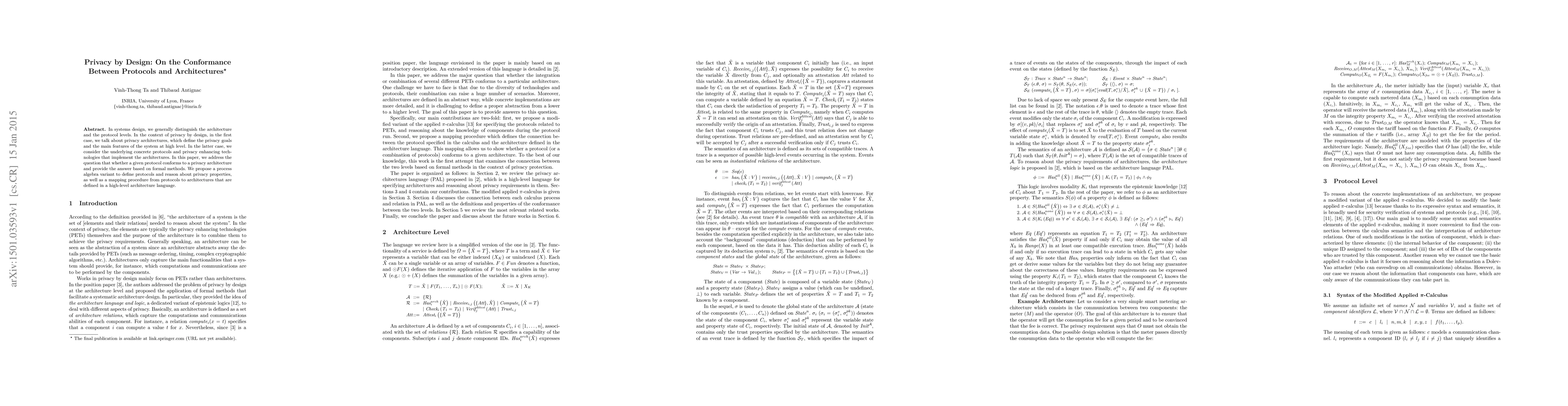 This paper investigates the alignment between privacy architectures and the protocols that implement them, using formal methods to determine protocol conformance. It proposes a process algebra variant for protocol definition and a mapping procedure from high-level privacy architectures to concrete protocols.