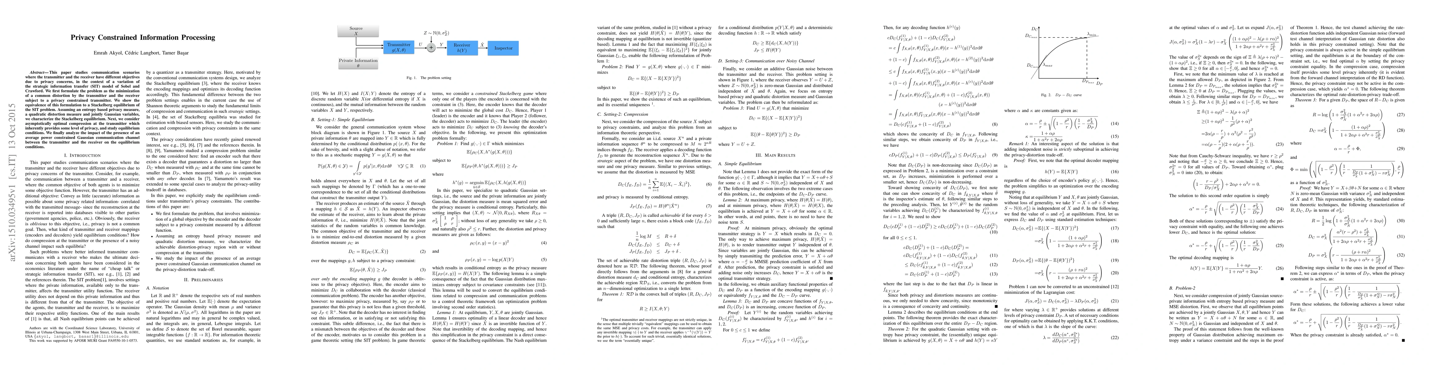 This paper examines communication scenarios with privacy concerns, formulating the problem as a Stackelberg equilibrium in a strategic information transfer model. It characterizes the equilibrium under specific conditions, explores privacy-providing compression, and analyzes the impact of power-constrained channels on equilibrium conditions.