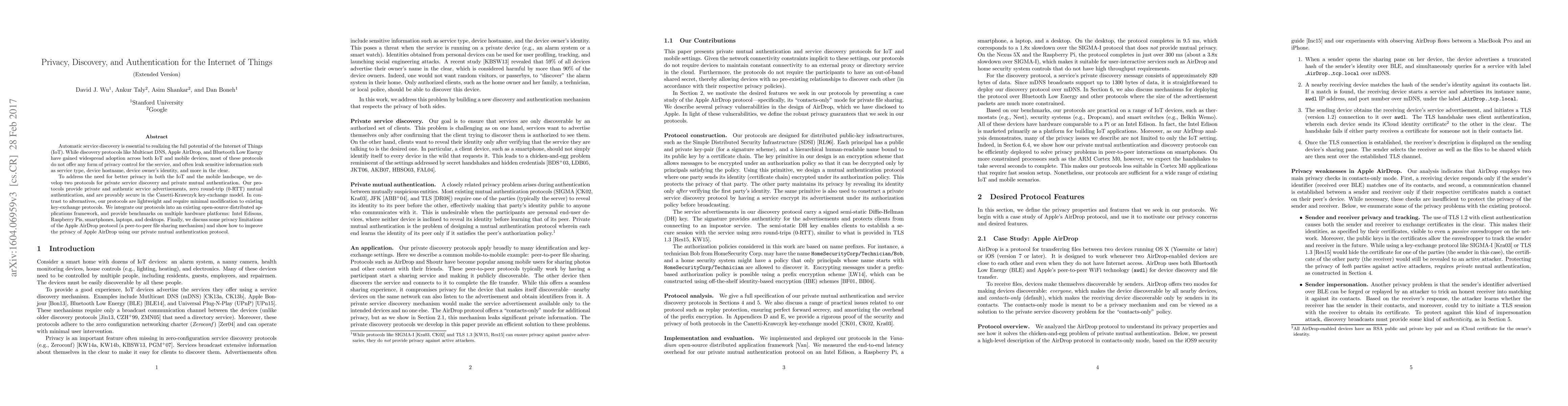 Automatic service discovery is essential to realizing the full potential of the Internet of Things (IoT). While discovery protocols like Multicast DNS, Apple AirDrop, and Bluetooth Low Energy have gained widespread adoption across both IoT and mobile devices, most of these protocols do not offer any form of privacy control for the service, and often leak sensitive information such as service type, device hostname, device owner's identity, and more in the clear. To address the need for better privacy in both the IoT and the mobile landscape, we develop two protocols for private service discovery and private mutual authentication. Our protocols provide private and authentic service advertisements, zero round-trip (0-RTT) mutual authentication, and are provably secure in the Canetti-Krawczyk key-exchange model. In contrast to alternatives, our protocols are lightweight and require minimal modification to existing key-exchange protocols. We integrate our protocols into an existing open-source distributed applications framework, and provide benchmarks on multiple hardware platforms: Intel Edisons, Raspberry Pis, smartphones, laptops, and desktops. Finally, we discuss some privacy limitations of the Apple AirDrop protocol (a peer-to-peer file sharing mechanism) and show how to improve the privacy of Apple AirDrop using our private mutual authentication protocol.