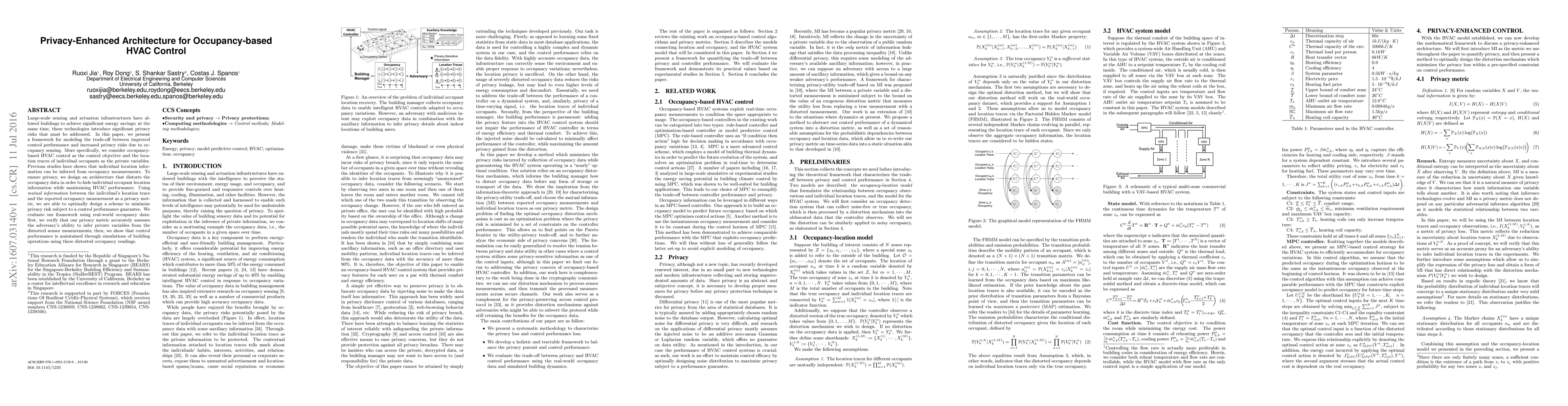 This paper proposes a framework for occupancy-based HVAC control that balances energy efficiency with privacy protection by distorting occupancy data to hide individual location information. The authors evaluate their approach using real-world data, demonstrating that privacy risks are minimized while maintaining HVAC performance.