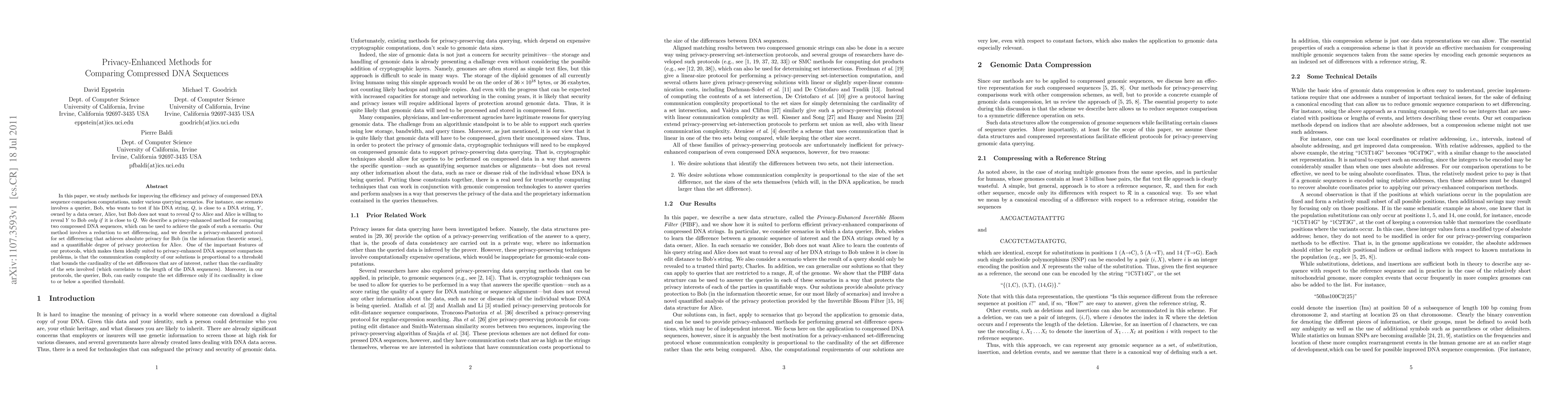This paper proposes privacy-enhanced methods for efficiently comparing compressed DNA sequences while ensuring data privacy. It introduces a protocol for set differencing that guarantees Bob's privacy and provides Alice with quantifiable privacy protection, with communication complexity tied to relevant set differences rather than sequence lengths.