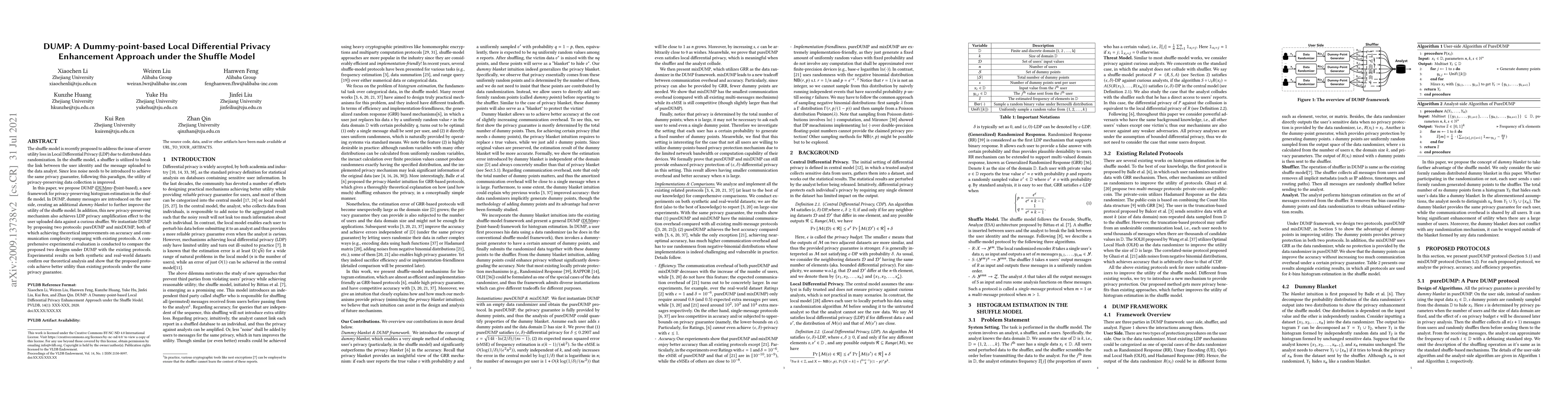 The paper proposes DUMP, a framework for enhancing privacy in the shuffle model using dummy points, which significantly improves communication efficiency by at least 3 orders of magnitude compared to existing protocols, while maintaining competitive utility.