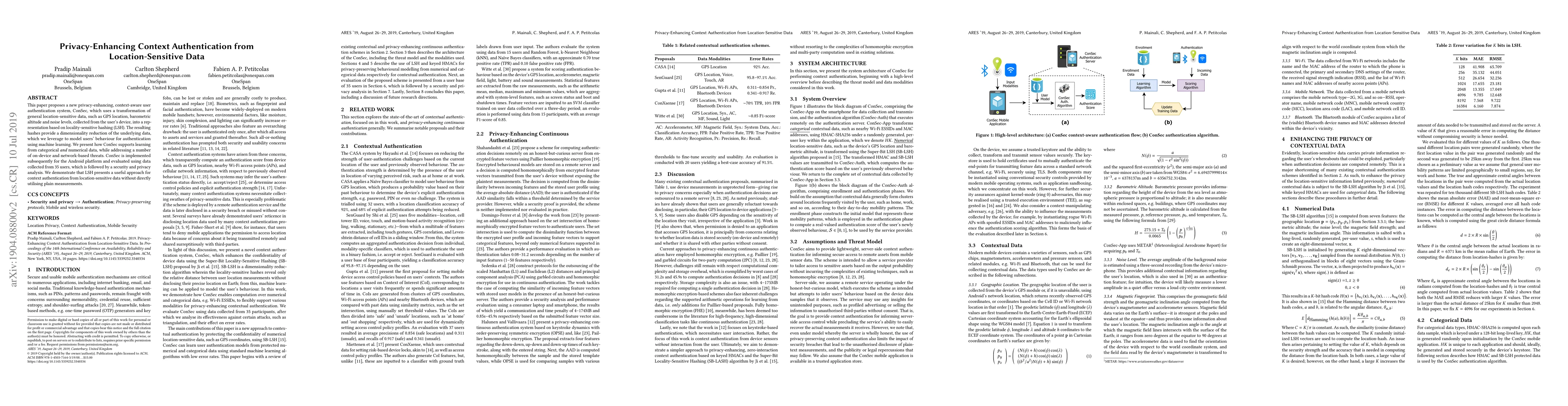 ConSec proposes a privacy-enhancing context authentication system using locality-sensitive hashing to transform location data into hashes for user behavior modeling.