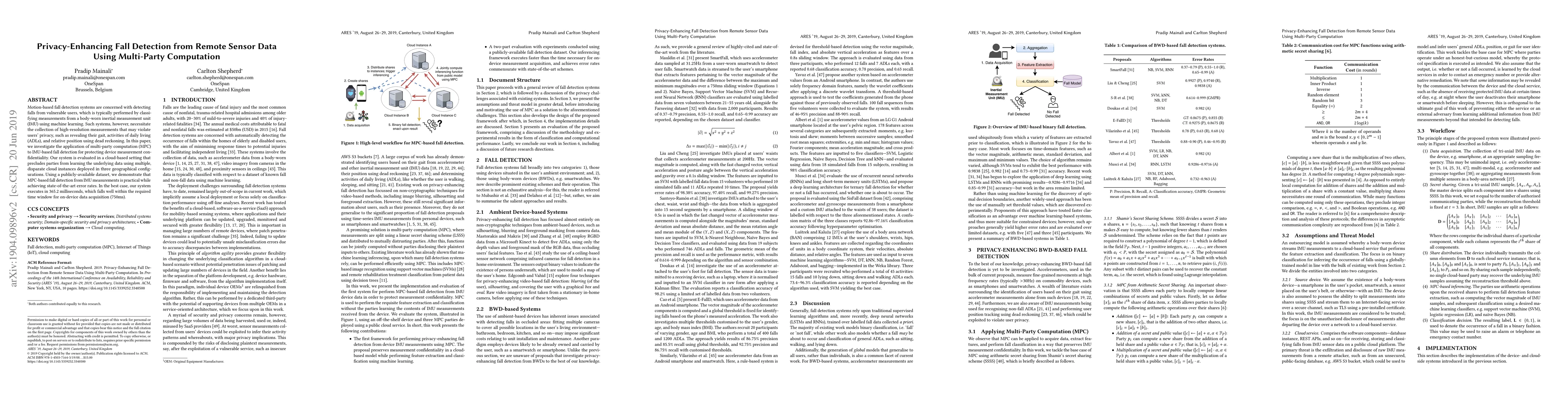 This paper explores the use of multi-party computation (MPC) to enhance privacy in fall detection systems based on body-worn inertial measurement units (IMUs). The proposed MPC-based approach ensures privacy by preventing any single party from accessing raw measurement data, achieving state-of-the-art error rates while maintaining real-time performance.