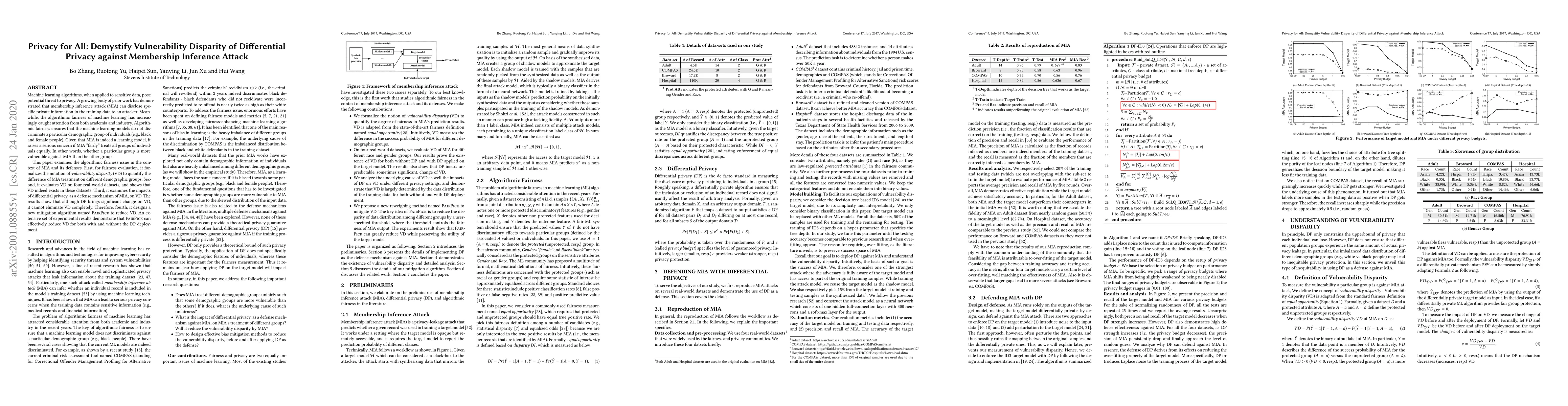 This paper investigates the fairness of membership inference attacks (MIA) against different demographic groups, introducing the concept of vulnerability disparity (VD) to quantify these differences. It demonstrates that differential privacy (DP) can mitigate but not eliminate VD, and proposes a new mitigation algorithm named FAIRPICK to effectively reduce VD across various datasets.