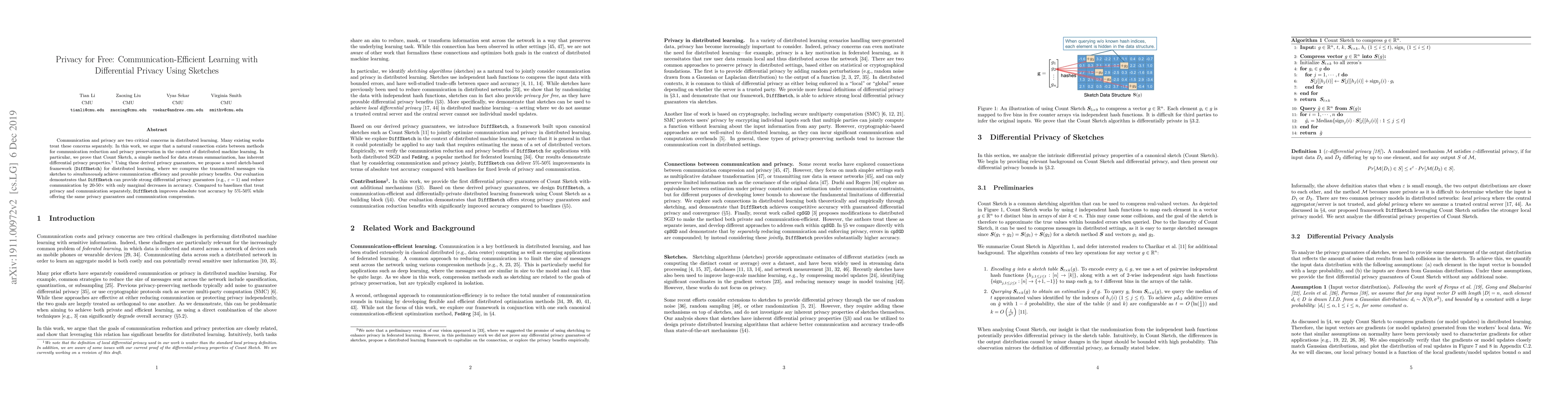 This paper presents DiffSketch, a novel framework for communication-efficient distributed machine learning that leverages Count Sketch for inherent differential privacy. It demonstrates that DiffSketch can achieve strong privacy guarantees while reducing communication by 20-50x and improving test accuracy by 5%-50% compared to baselines.