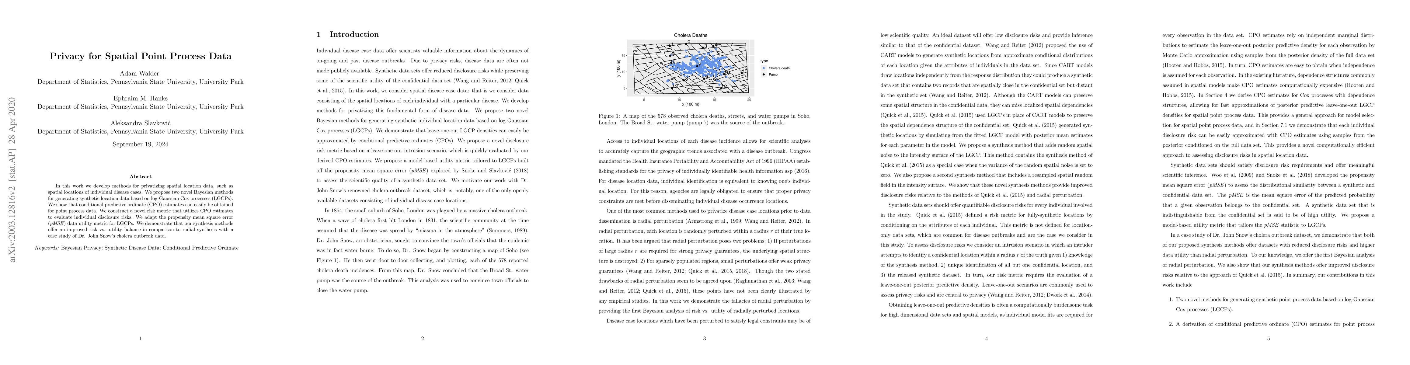 In this work we develop methods for privatizing spatial location data, such as spatial locations of individual disease cases. We propose two novel Bayesian methods for generating synthetic location data based on log-Gaussian Cox processes (LGCPs). We show that conditional predictive ordinate (CPO) estimates can easily be obtained for point process data. We construct a novel risk metric that utilizes CPO estimates to evaluate individual disclosure risks. We adapt the propensity mean square error (pMSE) data utility metric for LGCPs. We demonstrate that our synthesis methods offer an improved risk vs. utility balance in comparison to radial synthesis with a case study of Dr. John Snow's cholera outbreak data.