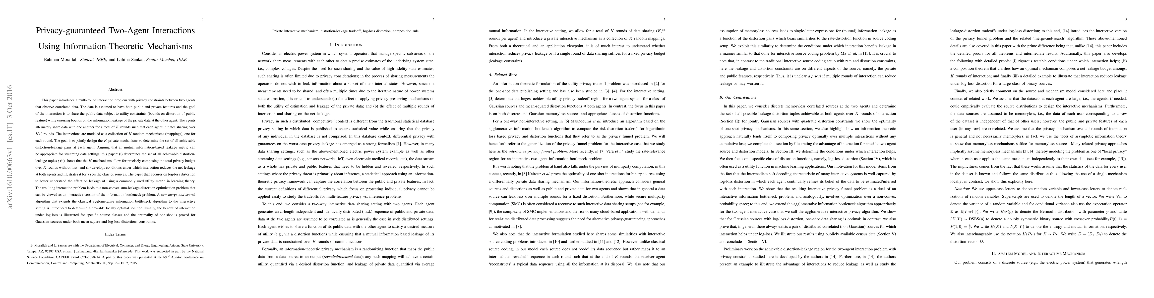 This paper introduces a multi-round interaction problem with privacy constraints between two agents that observe correlated data. The agents alternately share data with one another for a total of K rounds such that each agent initiates sharing over K/2 rounds. The interactions are modeled as a collection of K random mechanisms (mappings), one for each round. The goal is to jointly design the K private mechanisms to determine the set of all achievable distortion-leakage pairs at each agent. Arguing that a mutual information-based leakage metric can be appropriate for streaming data settings, this paper: (i) determines the set of all achievable distortion- leakage tuples ; (ii) shows that the K mechanisms allow for precisely composing the total privacy budget over K rounds without loss; and (ii) develops conditions under which interaction reduces the net leakage at both agents and illustrates it for a specific class of sources. The paper then focuses on log-loss distortion to better understand the effect on leakage of using a commonly used utility metric in learning theory. The resulting interaction problem leads to a non-convex sum-leakage-distortion optimization problem that can be viewed as an interactive version of the information bottleneck problem. A new merge-and-search algorithm that extends the classical agglomerative information bottleneck algorithm to the interactive setting is introduced to determine a provable locally optimal solution. Finally, the benefit of interaction under log-loss is illustrated for specific source classes and the optimality of one-shot is proved for Gaussian sources under both mean-square and log-loss distortions constraints.