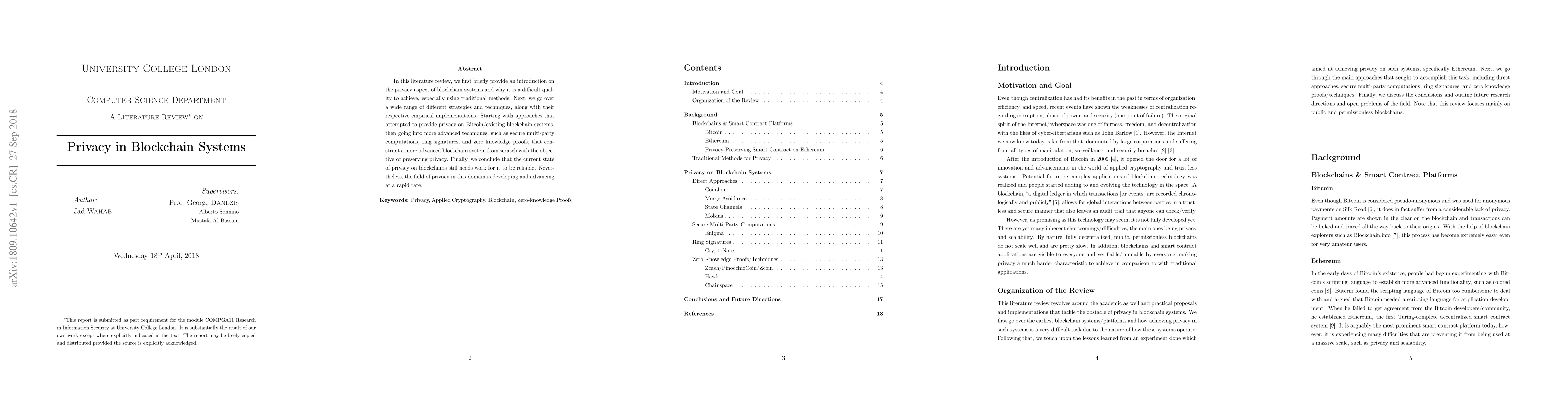A literature review on blockchain privacy finds that current methods are limited and new techniques like secure multi-party computations and zero knowledge proofs hold promise for improving privacy. Despite progress, the field still needs significant work to achieve reliable blockchain privacy.