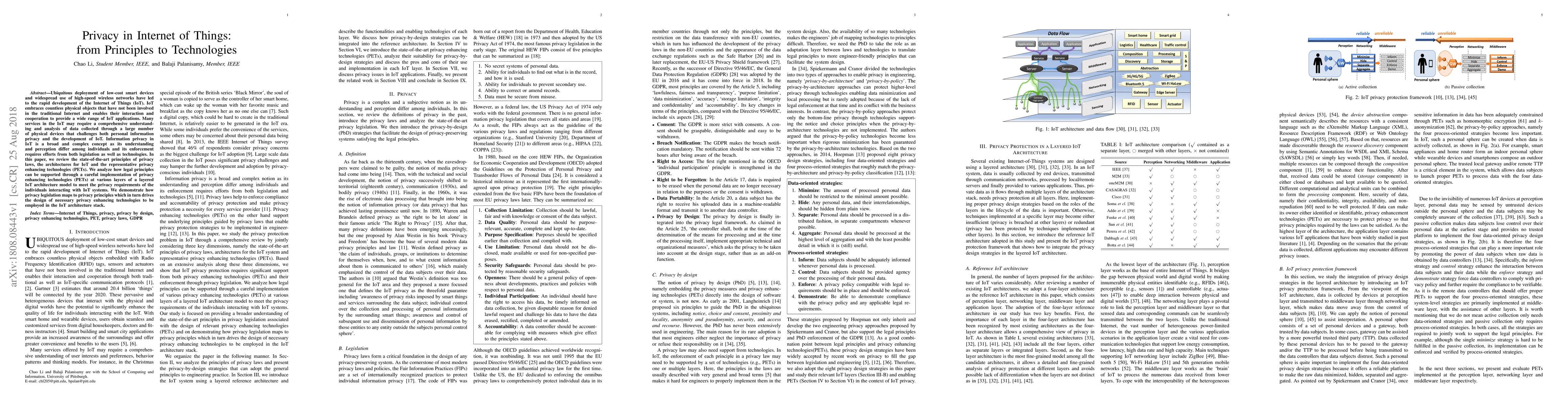 This paper reviews the principles of privacy laws and the architectures for IoT, focusing on how privacy-enhancing technologies (PETs) can be implemented to support legal privacy requirements across various layers of the IoT architecture. It demonstrates the interplay between privacy legislation and the design of PETs to ensure individual privacy in IoT systems.