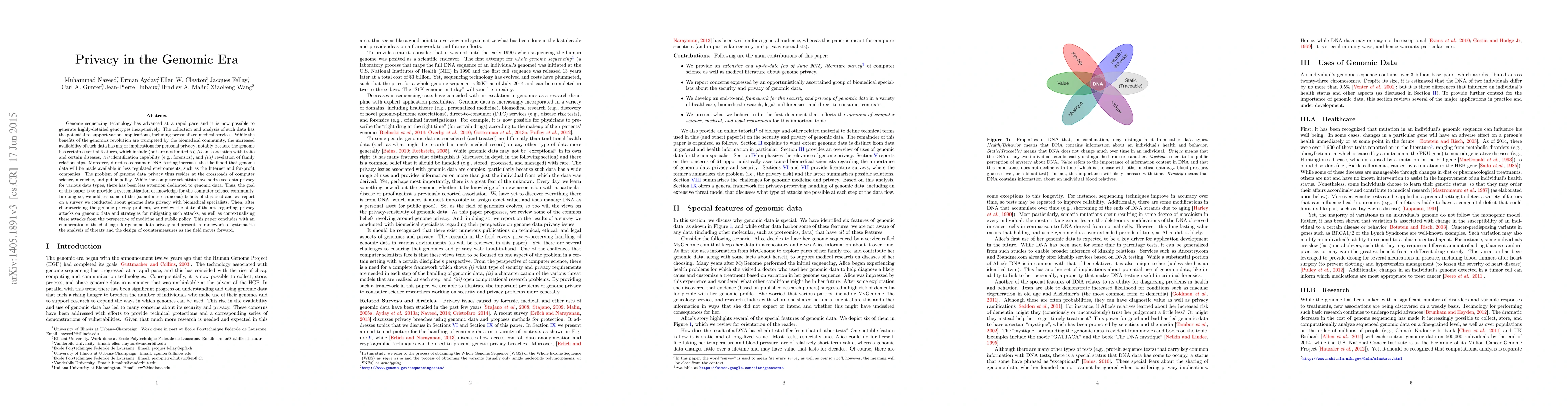 Genome sequencing technology has advanced at a rapid pace and it is now possible to generate highly-detailed genotypes inexpensively. The collection and analysis of such data has the potential to support various applications, including personalized medical services. While the benefits of the genomics revolution are trumpeted by the biomedical community, the increased availability of such data has major implications for personal privacy; notably because the genome has certain essential features, which include (but are not limited to) (i) an association with traits and certain diseases, (ii) identification capability (e.g., forensics), and (iii) revelation of family relationships. Moreover, direct-to-consumer DNA testing increases the likelihood that genome data will be made available in less regulated environments, such as the Internet and for-profit companies. The problem of genome data privacy thus resides at the crossroads of computer science, medicine, and public policy. While the computer scientists have addressed data privacy for various data types, there has been less attention dedicated to genomic data. Thus, the goal of this paper is to provide a systematization of knowledge for the computer science community. In doing so, we address some of the (sometimes erroneous) beliefs of this field and we report on a survey we conducted about genome data privacy with biomedical specialists. Then, after characterizing the genome privacy problem, we review the state-of-the-art regarding privacy attacks on genomic data and strategies for mitigating such attacks, as well as contextualizing these attacks from the perspective of medicine and public policy. This paper concludes with an enumeration of the challenges for genome data privacy and presents a framework to systematize the analysis of threats and the design of countermeasures as the field moves forward.
