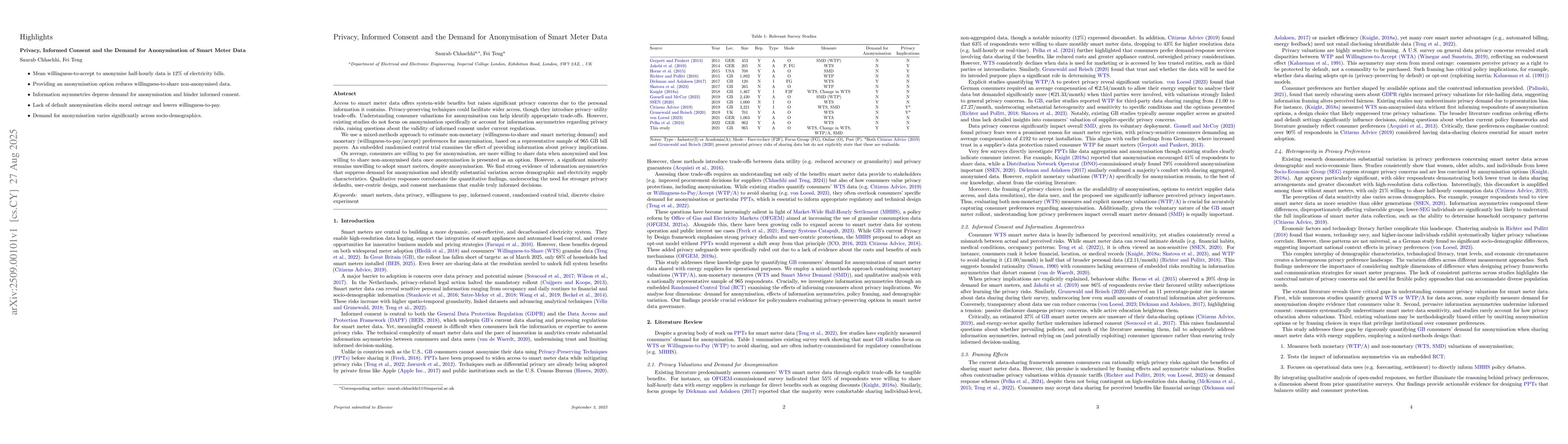 Access to smart meter data offers system-wide benefits but raises significant privacy concerns due to the personal information it contains. Privacy-preserving techniques could facilitate wider access, though they introduce privacy-utility trade-offs. Understanding consumer valuations for anonymisation can help identify appropriate trade-offs. However, existing studies do not focus on anonymisation specifically or account for information asymmetries regarding privacy risks, raising questions about the validity of informed consent under current regulations. We use a mixed-methods approach to estimate non-monetary (willingness-to-share and smart metering demand) and monetary (willingness-to-pay/accept) preferences for anonymisation, based on a representative sample of 965 GB bill payers. An embedded randomised control trial examines the effect of providing information about privacy implications. On average, consumers are willing to pay for anonymisation, are more willing to share data when anonymised and less willing to share non-anonymised data once anonymisation is presented as an option. However, a significant minority remains unwilling to adopt smart meters, despite anonymisation. We find strong evidence of information asymmetries that suppress demand for anonymisation and identify substantial variation across demographic and electricity supply characteristics. Qualitative responses corroborate the quantitative findings, underscoring the need for stronger privacy defaults, user-centric design, and consent mechanisms that enable truly informed decisions.