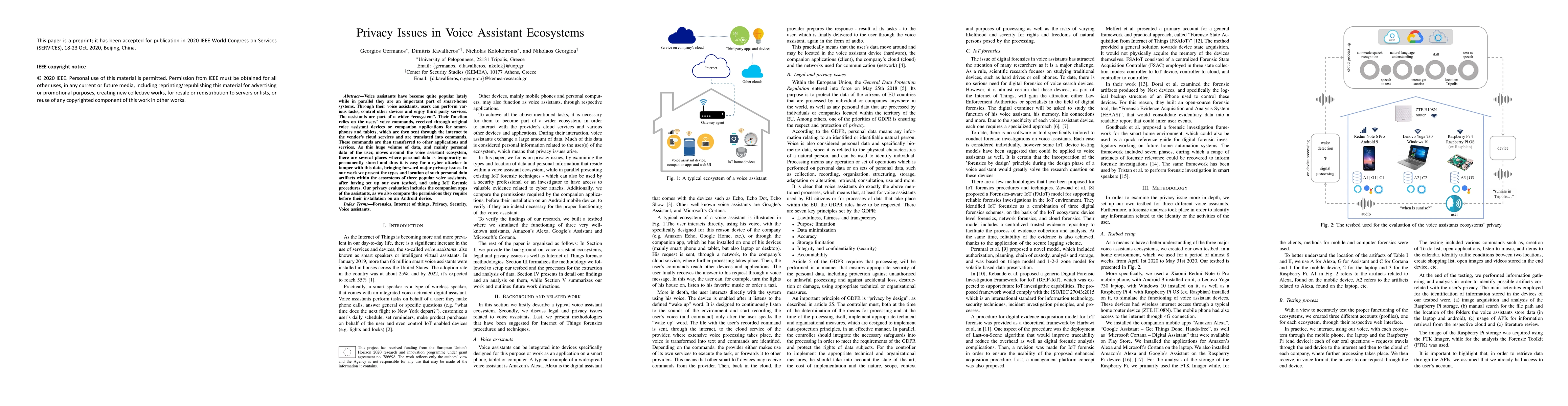 This paper investigates the privacy issues inherent in voice assistant ecosystems, identifying where personal data is stored and the risks posed by potential cyber attacks. It examines the data flows of three popular voice assistants using IoT forensic procedures and analyzes the permissions required by companion apps.