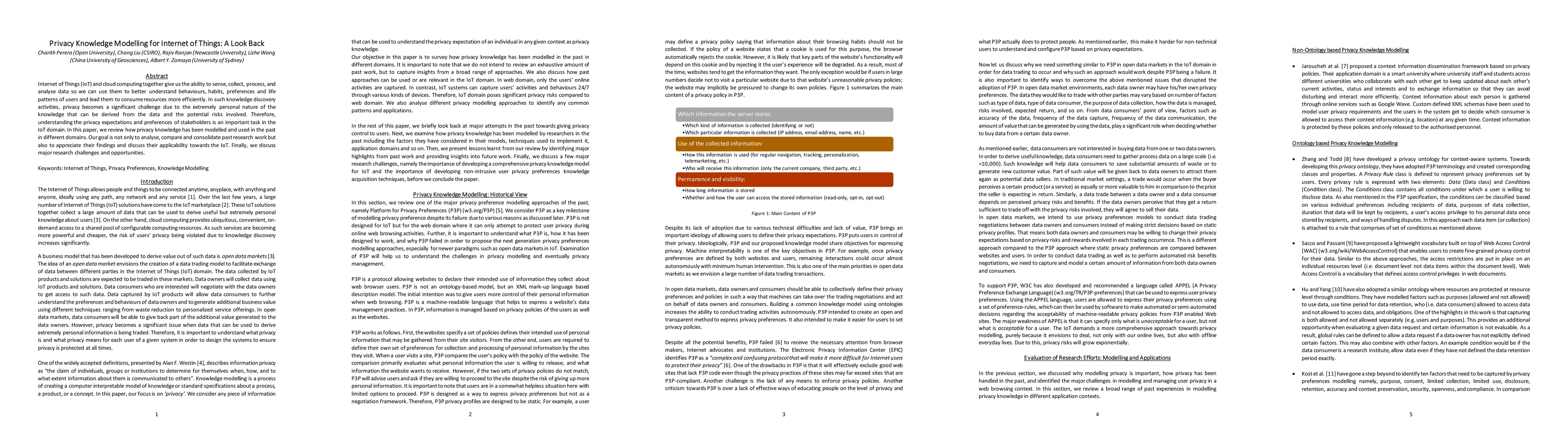 Internet of Things (IoT) and cloud computing together give us the ability to sense, collect, process, and analyse data so we can use them to better understand behaviours, habits, preferences and life patterns of users and lead them to consume resources more efficiently. In such knowledge discovery activities, privacy becomes a significant challenge due to the extremely personal nature of the knowledge that can be derived from the data and the potential risks involved. Therefore, understanding the privacy expectations and preferences of stakeholders is an important task in the IoT domain. In this paper, we review how privacy knowledge has been modelled and used in the past in different domains. Our goal is not only to analyse, compare and consolidate past research work but also to appreciate their findings and discuss their applicability towards the IoT. Finally, we discuss major research challenges and opportunities.
