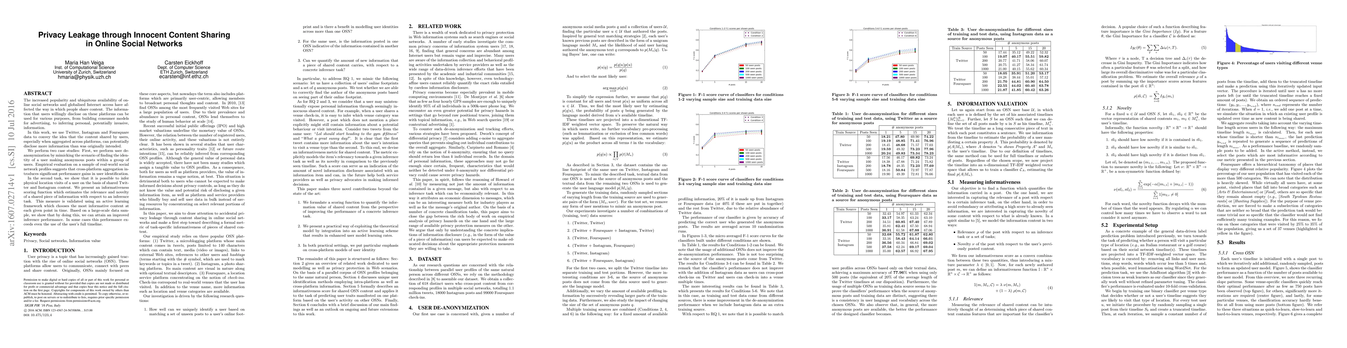 This research investigates how innocent content shared on social media platforms can inadvertently disclose personal information. The study uses Twitter, Instagram, and Foursquare data to demonstrate that aggregated content across platforms can lead to significant user de-anonymization and infer personal data like physical location visits.