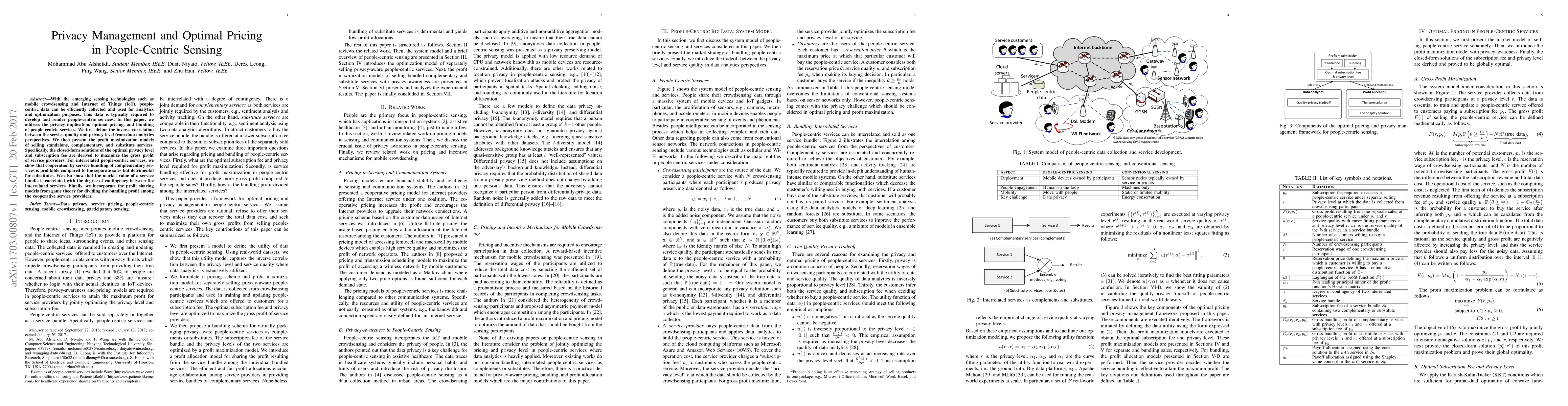 This paper explores how to balance privacy concerns with pricing for people-centric services in emerging sensing technologies, proposing models for optimal pricing and service bundling to maximize profits.