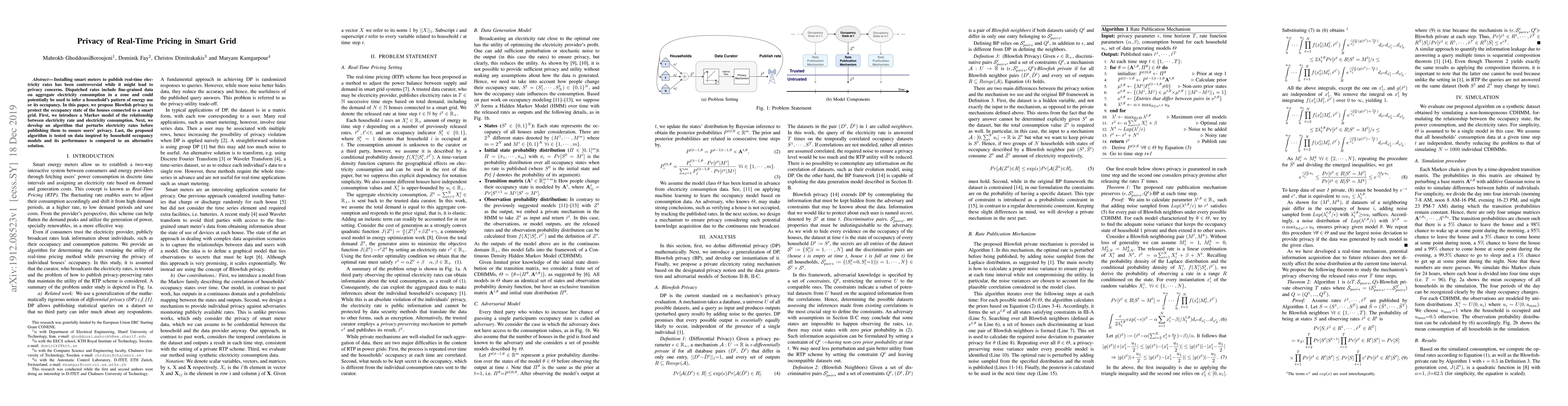 Installing smart meters to publish real-time electricity rates has been controversial while it might lead to privacy concerns. Dispatched rates include fine-grained data on aggregate electricity consumption in a zone and could potentially be used to infer a household's pattern of energy use or its occupancy. In this paper, we propose Blowfish privacy to protect the occupancy state of the houses connected to a smart grid. First, we introduce a Markov model of the relationship between electricity rate and electricity consumption. Next, we develop an algorithm that perturbs electricity rates before publishing them to ensure users' privacy. Last, the proposed algorithm is tested on data inspired by household occupancy models and its performance is compared to an alternative solution.