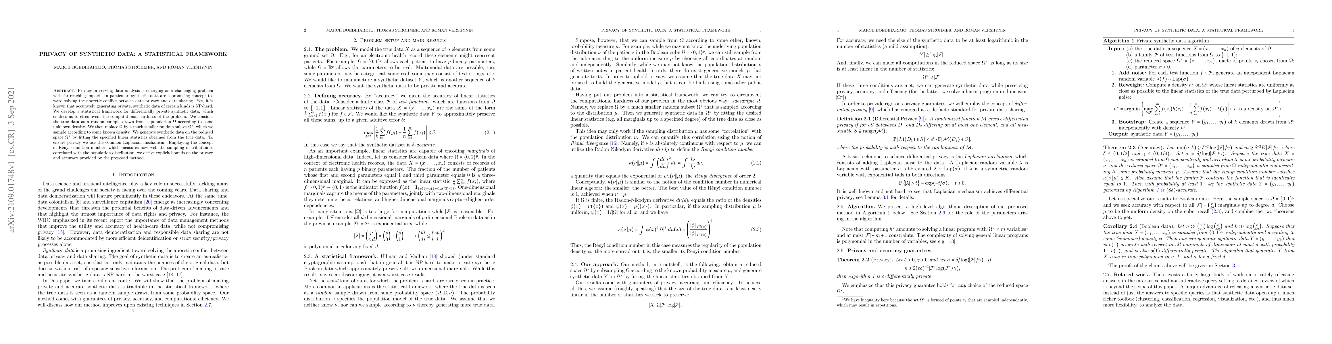 Privacy-preserving data analysis is emerging as a challenging problem with far-reaching impact. In particular, synthetic data are a promising concept toward solving the aporetic conflict between data privacy and data sharing. Yet, it is known that accurately generating private, synthetic data of certain kinds is NP-hard. We develop a statistical framework for differentially private synthetic data, which enables us to circumvent the computational hardness of the problem. We consider the true data as a random sample drawn from a population Omega according to some unknown density. We then replace Omega by a much smaller random subset Omega^*, which we sample according to some known density. We generate synthetic data on the reduced space Omega^* by fitting the specified linear statistics obtained from the true data. To ensure privacy we use the common Laplacian mechanism. Employing the concept of Renyi condition number, which measures how well the sampling distribution is correlated with the population distribution, we derive explicit bounds on the privacy and accuracy provided by the proposed method.
