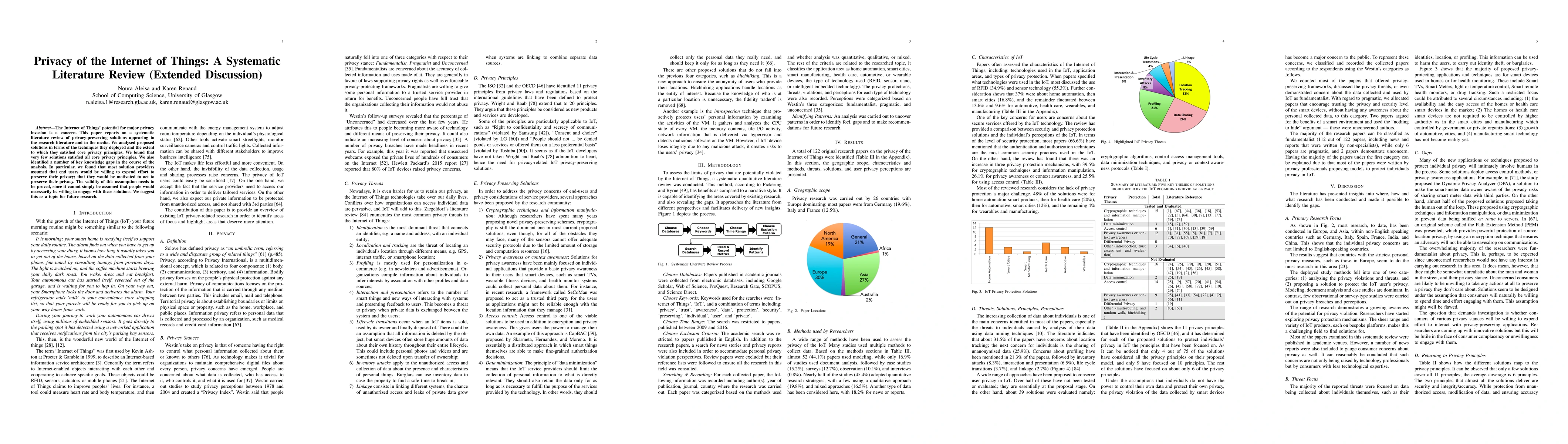 The Internet of Things' potential for major privacy invasion is a concern. This paper reports on a systematic literature review of privacy-preserving solutions appearing in the research literature and in the media. We analysed proposed solutions in terms of the techniques they deployed and the extent to which they satisfied core privacy principles. We found that very few solutions satisfied all core privacy principles. We also identified a number of key knowledge gaps in the course of the analysis. In particular, we found that most solution providers assumed that end users would be willing to expend effort to preserve their privacy; that they would be motivated to act to preserve their privacy. The validity of this assumption needs to be proved, since it cannot simply be assumed that people would necessarily be willing to engage with these solutions. We suggest this as a topic for future research.