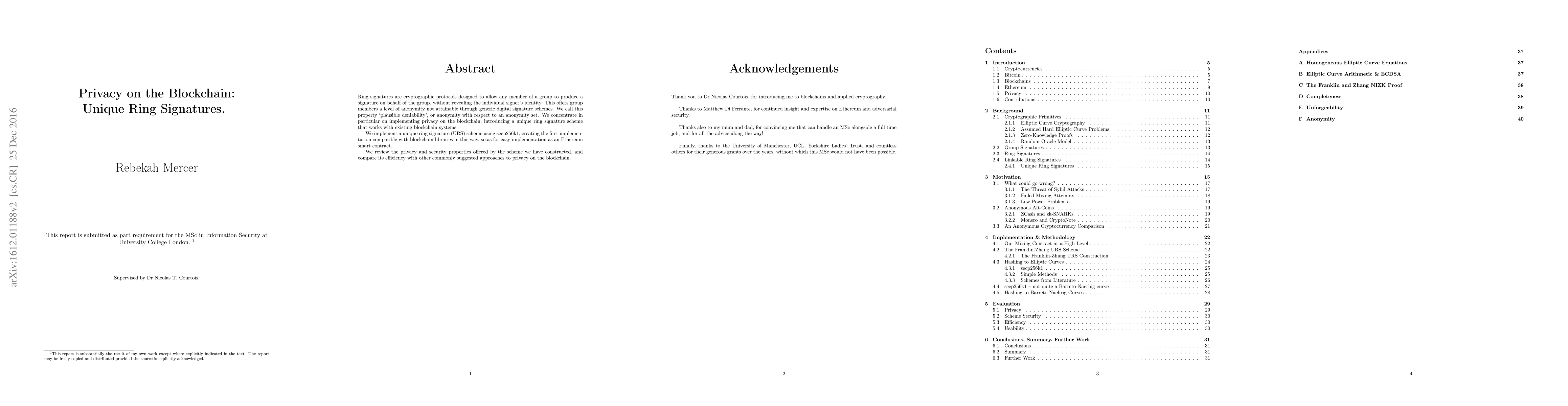 Ring signatures are cryptographic protocols designed to allow any member of a group to produce a signature on behalf of the group, without revealing the individual signer's identity. This offers group members a level of anonymity not attainable through generic digital signature schemes. We call this property 'plausible deniability', or anonymity with respect to an anonymity set. We concentrate in particular on implementing privacy on the blockchain, introducing a unique ring signature scheme that works with existing blockchain systems. We implement a unique ring signature (URS) scheme using secp256k1, creating the first implementation compatible with blockchain libraries in this way, so as for easy implementation as an Ethereum smart contract. We review the privacy and security properties offered by the scheme we have constructed, and compare its efficiency with other commonly suggested approaches to privacy on the blockchain.