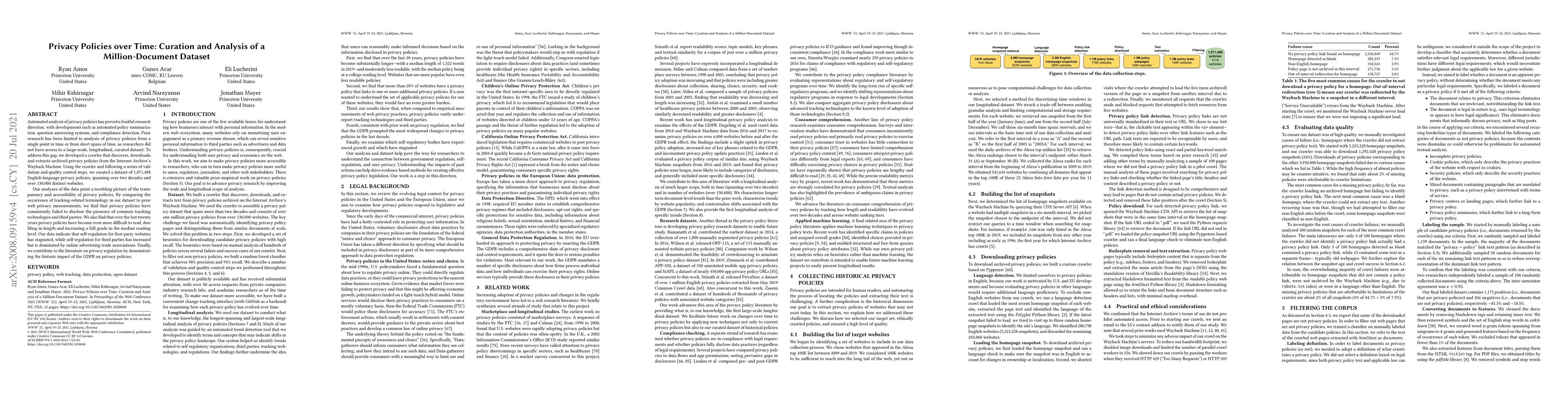 Automated analysis of privacy policies has proved a fruitful research direction, with developments such as automated policy summarization, question answering systems, and compliance detection. Prior research has been limited to analysis of privacy policies from a single point in time or from short spans of time, as researchers did not have access to a large-scale, longitudinal, curated dataset. To address this gap, we developed a crawler that discovers, downloads, and extracts archived privacy policies from the Internet Archive's Wayback Machine. Using the crawler and following a series of validation and quality control steps, we curated a dataset of 1,071,488 English language privacy policies, spanning over two decades and over 130,000 distinct websites. Our analyses of the data paint a troubling picture of the transparency and accessibility of privacy policies. By comparing the occurrence of tracking-related terminology in our dataset to prior web privacy measurements, we find that privacy policies have consistently failed to disclose the presence of common tracking technologies and third parties. We also find that over the last twenty years privacy policies have become even more difficult to read, doubling in length and increasing a full grade in the median reading level. Our data indicate that self-regulation for first-party websites has stagnated, while self-regulation for third parties has increased but is dominated by online advertising trade associations. Finally, we contribute to the literature on privacy regulation by demonstrating the historic impact of the GDPR on privacy policies.