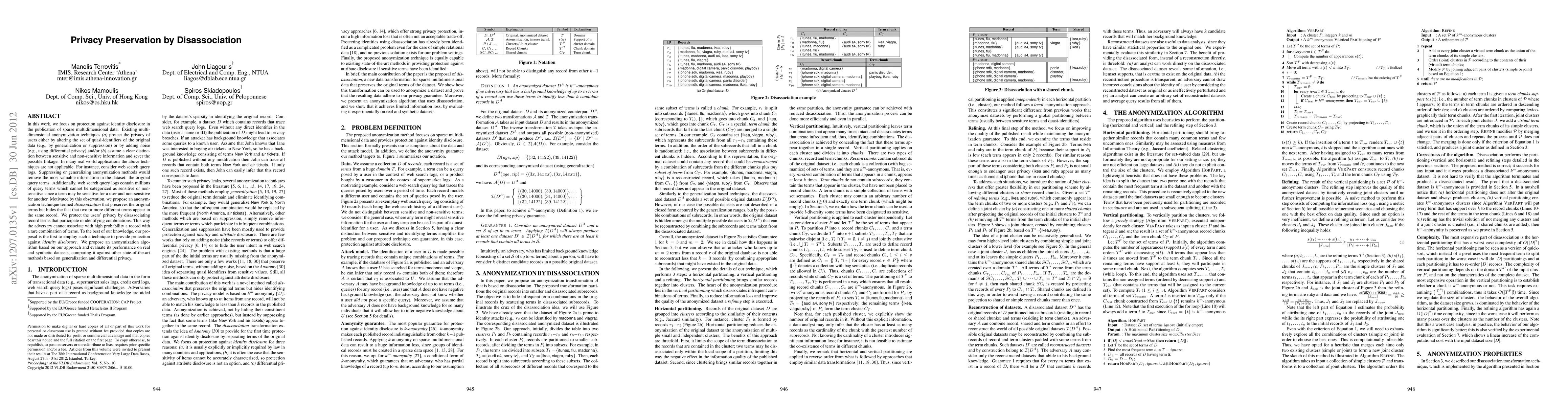 In this work, we focus on protection against identity disclosure in the publication of sparse multidimensional data. Existing multidimensional anonymization techniquesa) protect the privacy of users either by altering the set of quasi-identifiers of the original data (e.g., by generalization or suppression) or by adding noise (e.g., using differential privacy) and/or (b) assume a clear distinction between sensitive and non-sensitive information and sever the possible linkage. In many real world applications the above techniques are not applicable. For instance, consider web search query logs. Suppressing or generalizing anonymization methods would remove the most valuable information in the dataset: the original query terms. Additionally, web search query logs contain millions of query terms which cannot be categorized as sensitive or non-sensitive since a term may be sensitive for a user and non-sensitive for another. Motivated by this observation, we propose an anonymization technique termed disassociation that preserves the original terms but hides the fact that two or more different terms appear in the same record. We protect the users' privacy by disassociating record terms that participate in identifying combinations. This way the adversary cannot associate with high probability a record with a rare combination of terms. To the best of our knowledge, our proposal is the first to employ such a technique to provide protection against identity disclosure. We propose an anonymization algorithm based on our approach and evaluate its performance on real and synthetic datasets, comparing it against other state-of-the-art methods based on generalization and differential privacy.