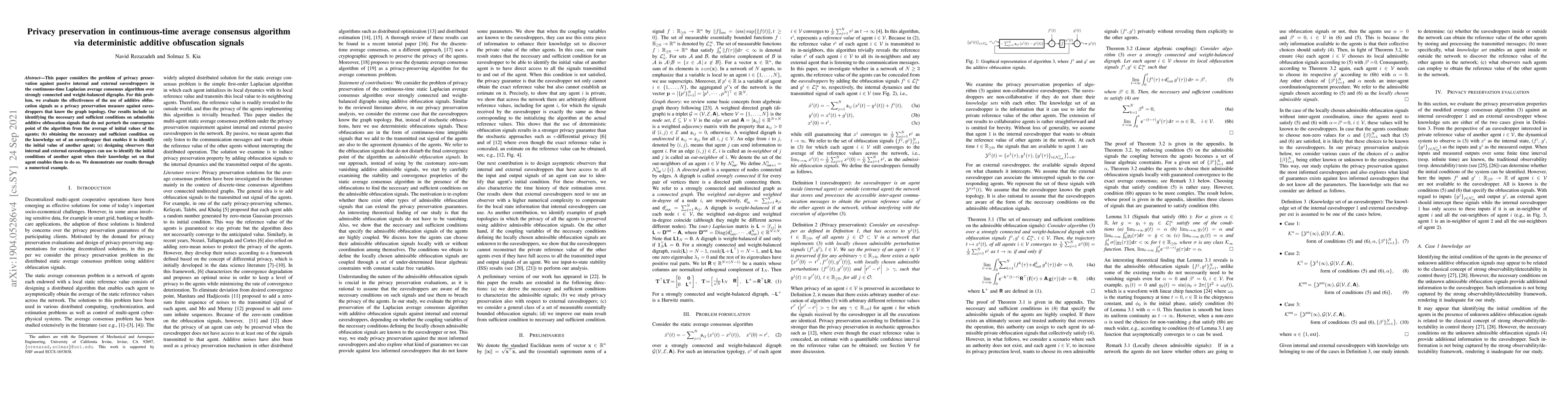 This paper explores privacy preservation in continuous-time average consensus algorithms using deterministic additive obfuscation signals. It identifies conditions for obfuscation signals that maintain convergence while thwarting malicious agents' attempts to identify initial agent values.
