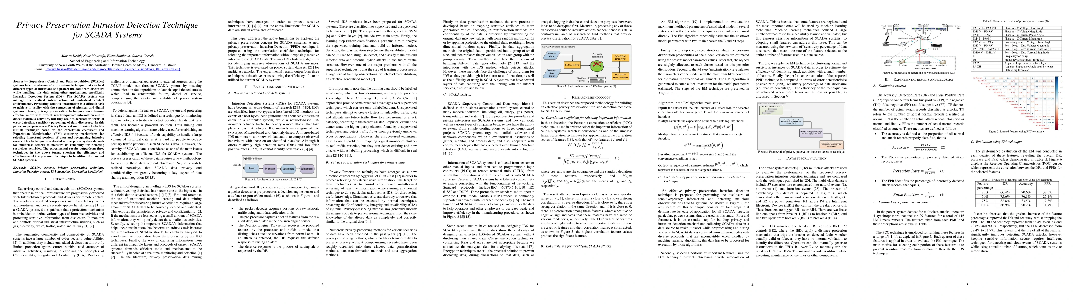 This paper proposes a Privacy Preservation Intrusion Detection (PPID) technique for SCADA systems, combining correlation coefficient and Expectation Maximisation clustering to detect intrusions while protecting sensitive data. Experimental results show superior performance in error detection and data disclosure sensitivity compared to existing methods.