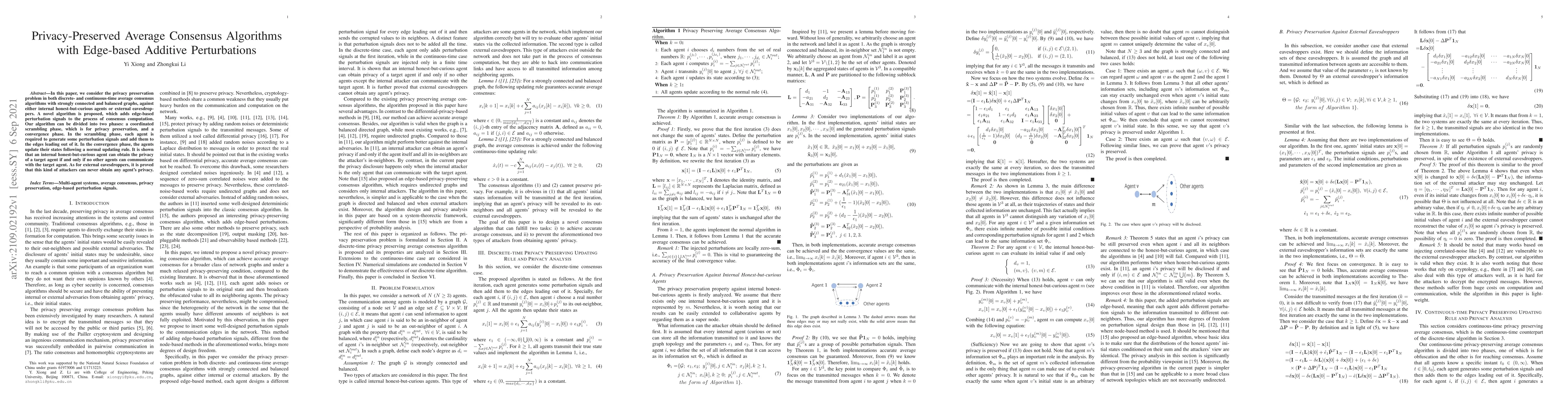 This paper proposes a novel privacy-preserved average consensus algorithm using edge-based additive perturbations, divided into a scrambling phase for privacy and a convergence phase for normal updating. It ensures privacy against internal and external threats by adding perturbation signals to the consensus computation process.