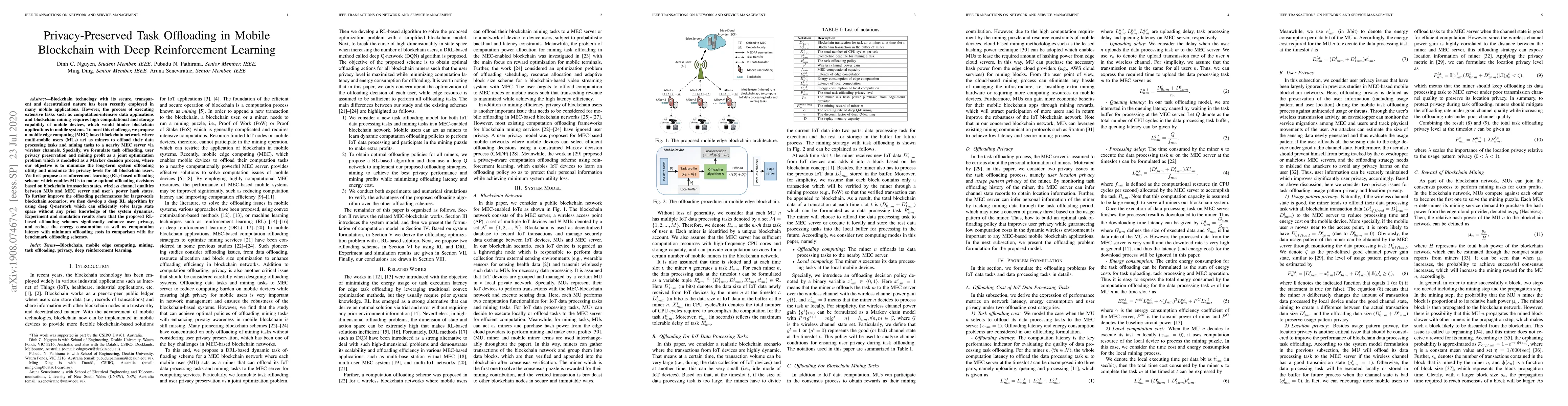 This paper proposes a mobile edge computing (MEC) based blockchain network where mobile users offload mining tasks to an MEC server to reduce computational demands. It employs deep reinforcement learning to optimize task offloading and user privacy, achieving lower costs, energy consumption, and latency while enhancing user privacy.