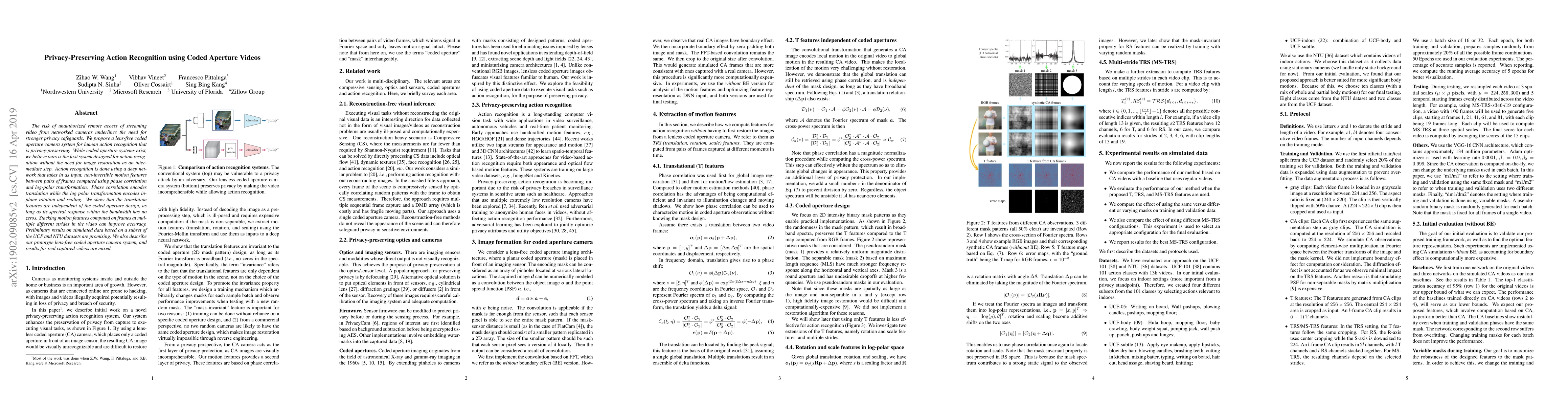 This paper proposes a privacy-preserving lens-free coded aperture camera system for human action recognition that avoids image restoration, using deep networks and non-invertible motion features. Preliminary results on simulated data show promise, but real-captured video results are mixed.