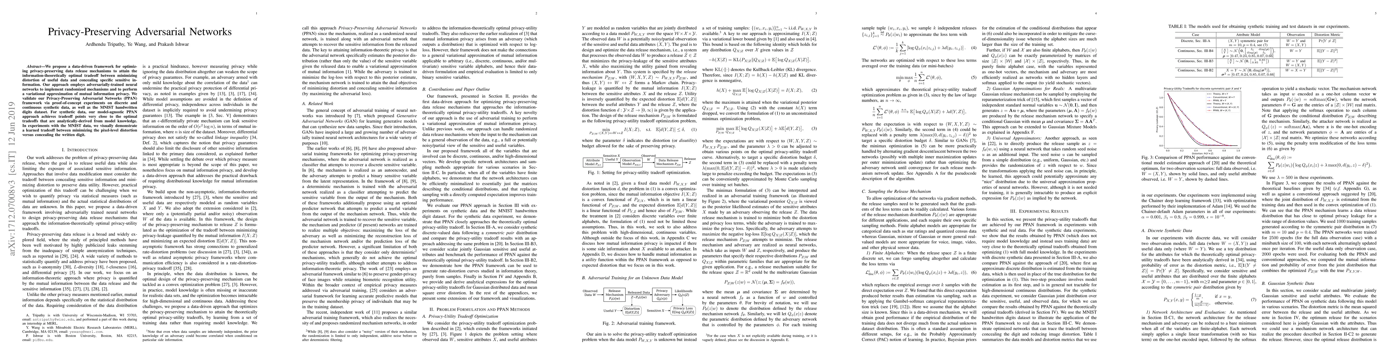 This paper introduces a framework using adversarially-trained neural networks to optimize privacy-preserving data release, achieving near-optimal tradeoffs between data utility and privacy. The proposed Privacy-Preserving Adversarial Networks (PPAN) are validated on synthetic and MNIST data, demonstrating effective concealment of sensitive information while minimizing data distortion.