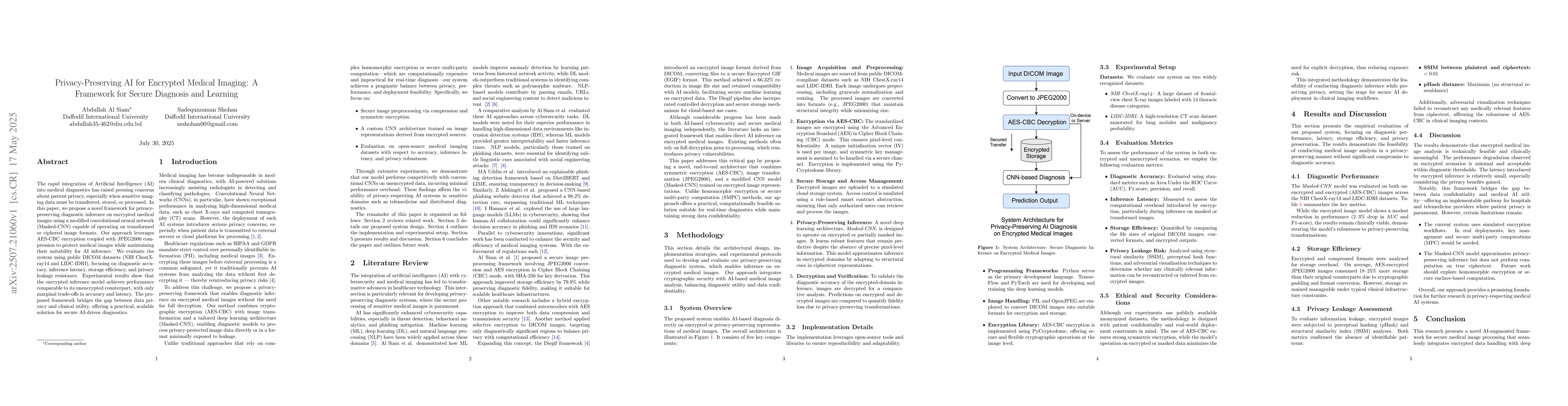 The rapid integration of Artificial Intelligence (AI) into medical diagnostics has raised pressing concerns about patient privacy, especially when sensitive imaging data must be transferred, stored, or processed. In this paper, we propose a novel framework for privacy-preserving diagnostic inference on encrypted medical images using a modified convolutional neural network (Masked-CNN) capable of operating on transformed or ciphered image formats. Our approach leverages AES-CBC encryption coupled with JPEG2000 compression to protect medical images while maintaining their suitability for AI inference. We evaluate the system using public DICOM datasets (NIH ChestX-ray14 and LIDC-IDRI), focusing on diagnostic accuracy, inference latency, storage efficiency, and privacy leakage resistance. Experimental results show that the encrypted inference model achieves performance comparable to its unencrypted counterpart, with only marginal trade-offs in accuracy and latency. The proposed framework bridges the gap between data privacy and clinical utility, offering a practical, scalable solution for secure AI-driven diagnostics.