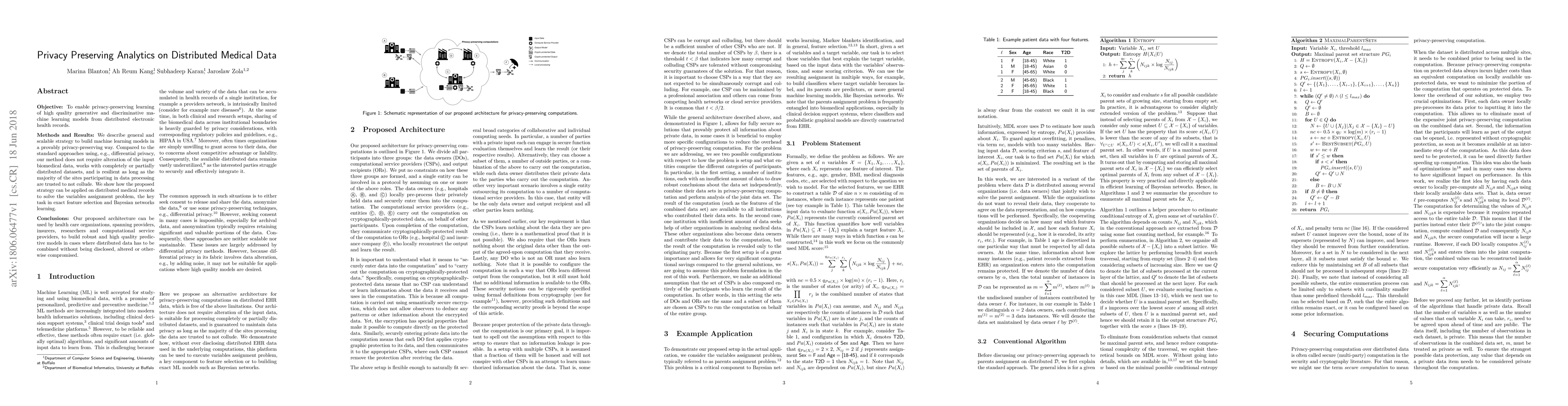 Objective: To enable privacy-preserving learning of high quality generative and discriminative machine learning models from distributed electronic health records. Methods and Results: We describe general and scalable strategy to build machine learning models in a provably privacy-preserving way. Compared to the standard approaches using, e.g., differential privacy, our method does not require alteration of the input biomedical data, works with completely or partially distributed datasets, and is resilient as long as the majority of the sites participating in data processing are trusted to not collude. We show how the proposed strategy can be applied on distributed medical records to solve the variables assignment problem, the key task in exact feature selection and Bayesian networks learning. Conclusions: Our proposed architecture can be used by health care organizations, spanning providers, insurers, researchers and computational service providers, to build robust and high quality predictive models in cases where distributed data has to be combined without being disclosed, altered or otherwise compromised.