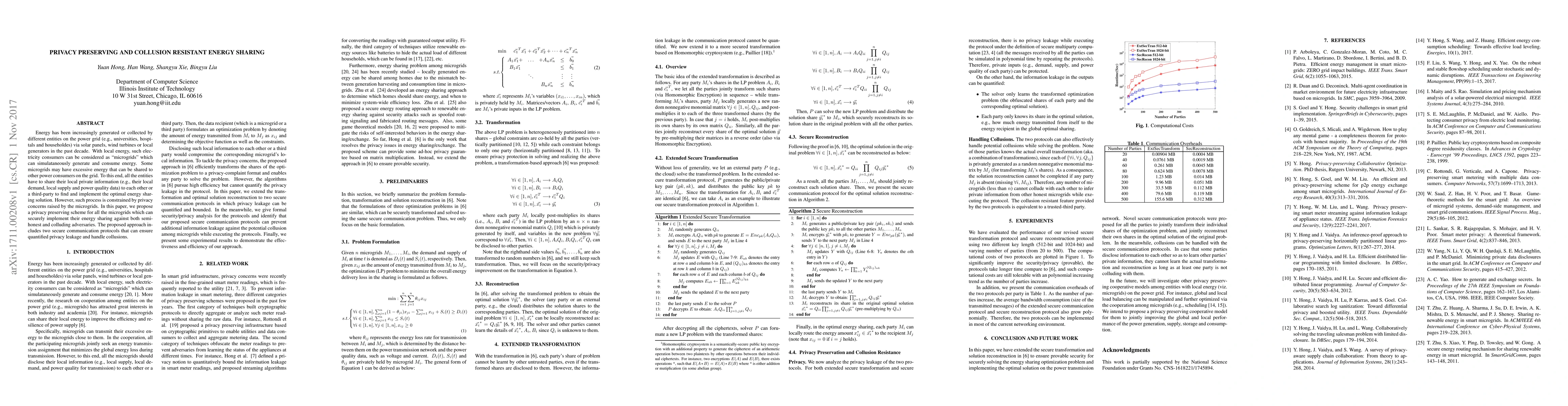 Energy has been increasingly generated or collected by different entities on the power grid (e.g., universities, hospitals and householdes) via solar panels, wind turbines or local generators in the past decade. With local energy, such electricity consumers can be considered as "microgrids" which can simulataneously generate and consume energy. Some microgrids may have excessive energy that can be shared to other power consumers on the grid. To this end, all the entities have to share their local private information (e.g., their local demand, local supply and power quality data) to each other or a third-party to find and implement the optimal energy sharing solution. However, such process is constrained by privacy concerns raised by the microgrids. In this paper, we propose a privacy preserving scheme for all the microgrids which can securely implement their energy sharing against both semi-honest and colluding adversaries. The proposed approach includes two secure communication protocols that can ensure quantified privacy leakage and handle collusions.