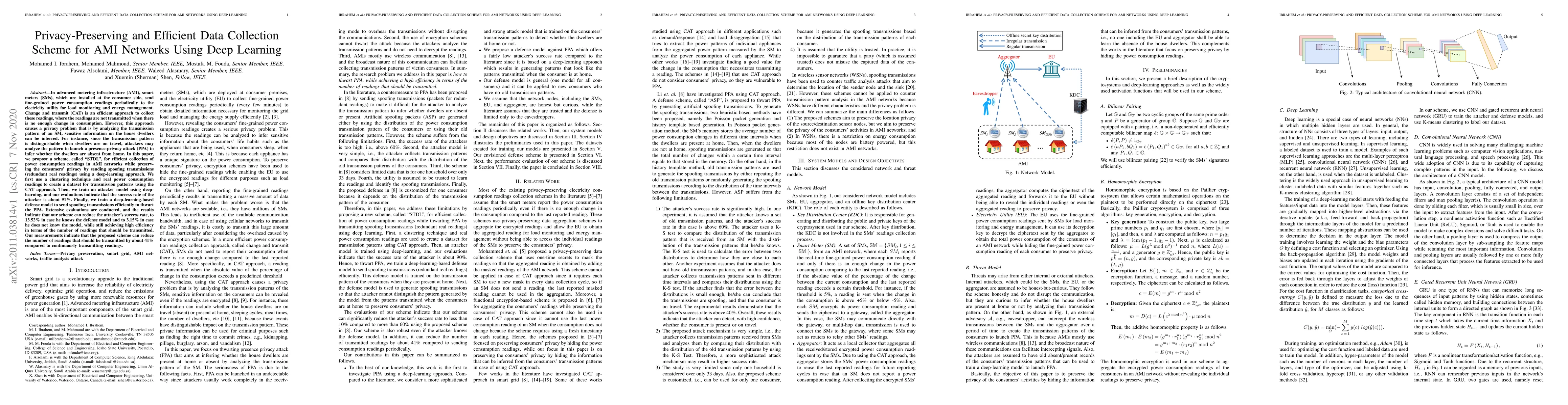 This paper proposes a privacy-preserving scheme, "STDL," for advanced metering infrastructure (AMI) networks that uses deep learning to send spoofing transmissions, thereby thwarting presence-privacy attacks while maintaining efficient data collection. The scheme reduces the attacker's success rate significantly and decreases the number of required transmissions by about 41%.