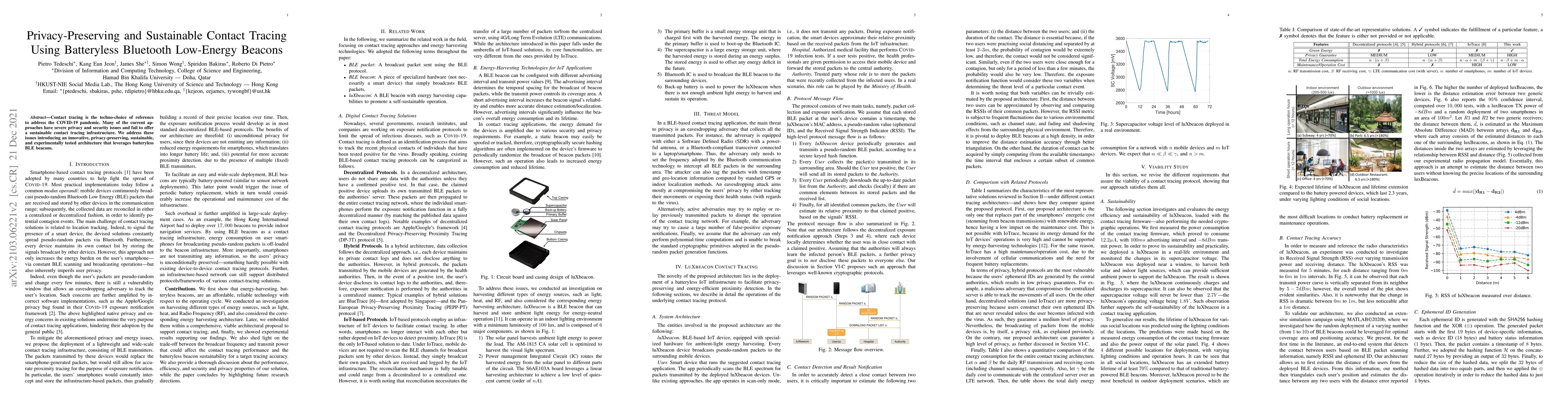 This paper proposes a privacy-preserving and sustainable contact tracing solution using batteryless Bluetooth Low-Energy beacons, addressing privacy and security concerns while offering a long-term infrastructure. The architecture has been experimentally validated to ensure its effectiveness.